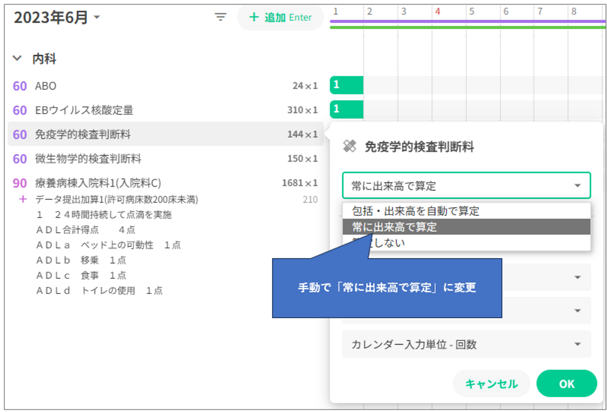 入院料に包括される判断料について(微生物学的検査判断料、免疫学的検査判断料)「微生物学的検査判断料」と「免疫学的検査判断料」は入院料に包括します。「微生物学的検査判断料」と「免疫学的検査判断料」を出来高で算定する場合は、手動で「常に出来高で算定」に変更していただく必要があります。