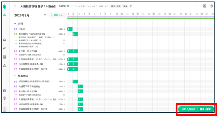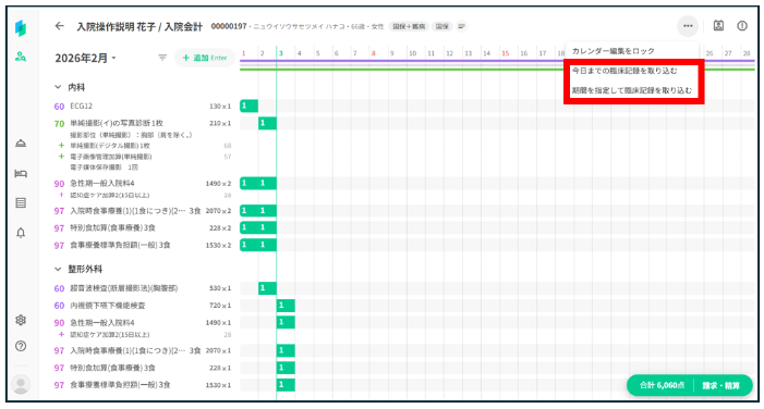 入院費用の概算は、該当月のコストカレンダー(以下コスカレ)を作成し、臨床記録を取り込んだうえで請求を作成することで確認できます。翌月分のコスカレが存在しない場合でも、臨床記録の取り込みにより自動作成されます。
