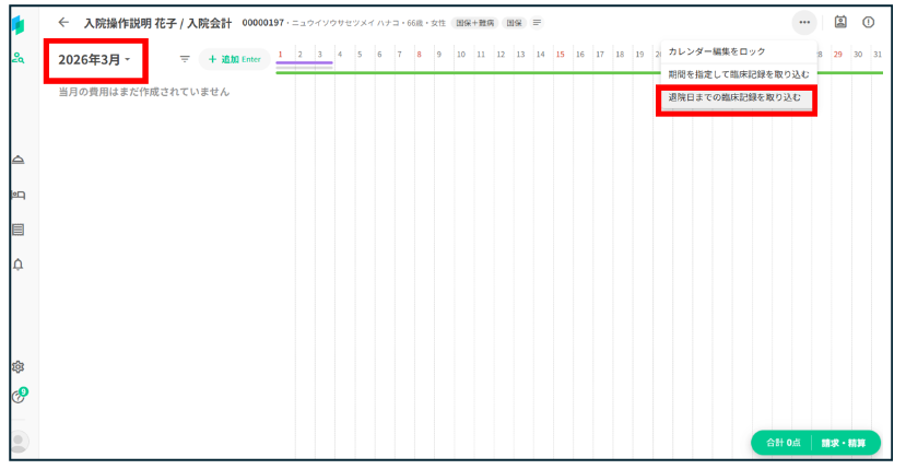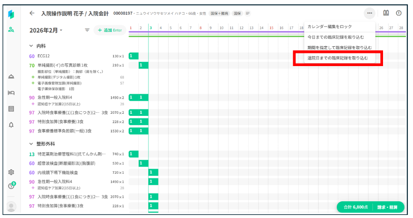 作成された翌月のコスカレを開き、再度「退院日までの臨床記録を取り込む」 を実行します