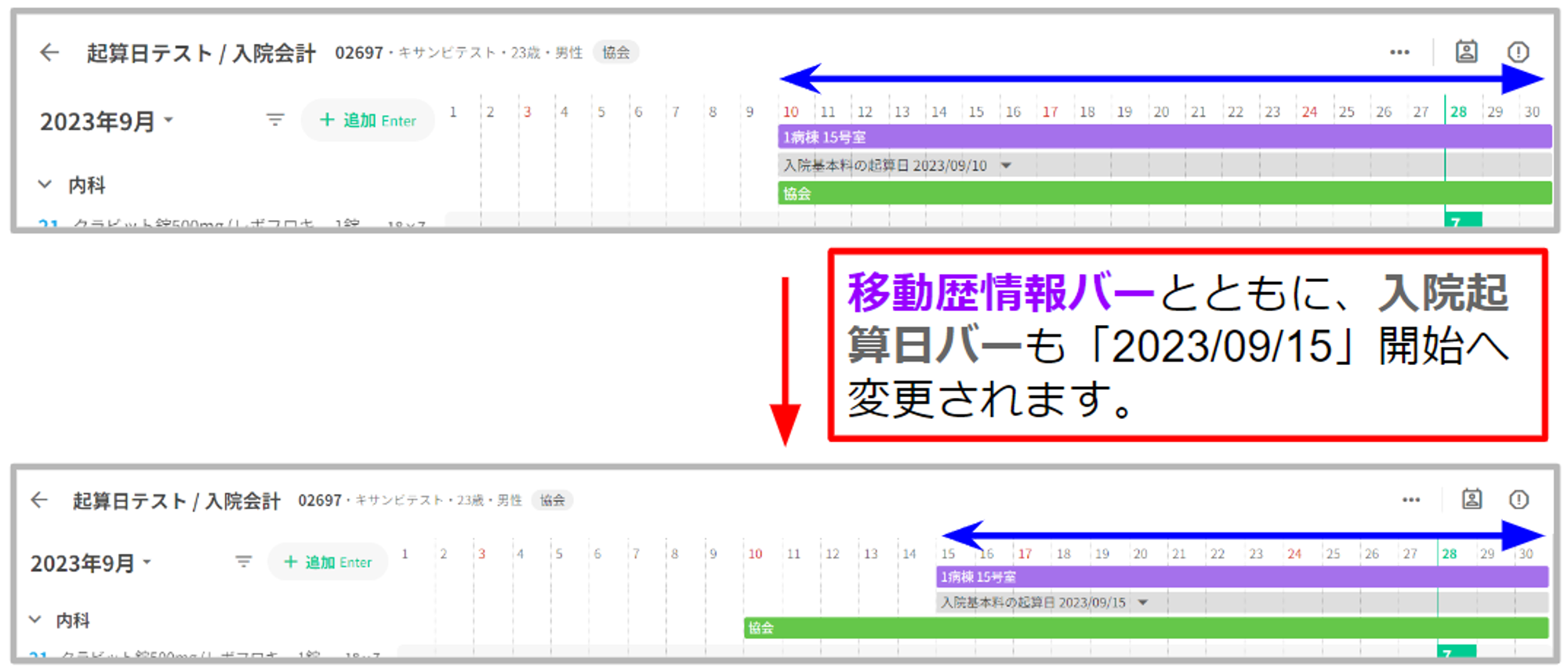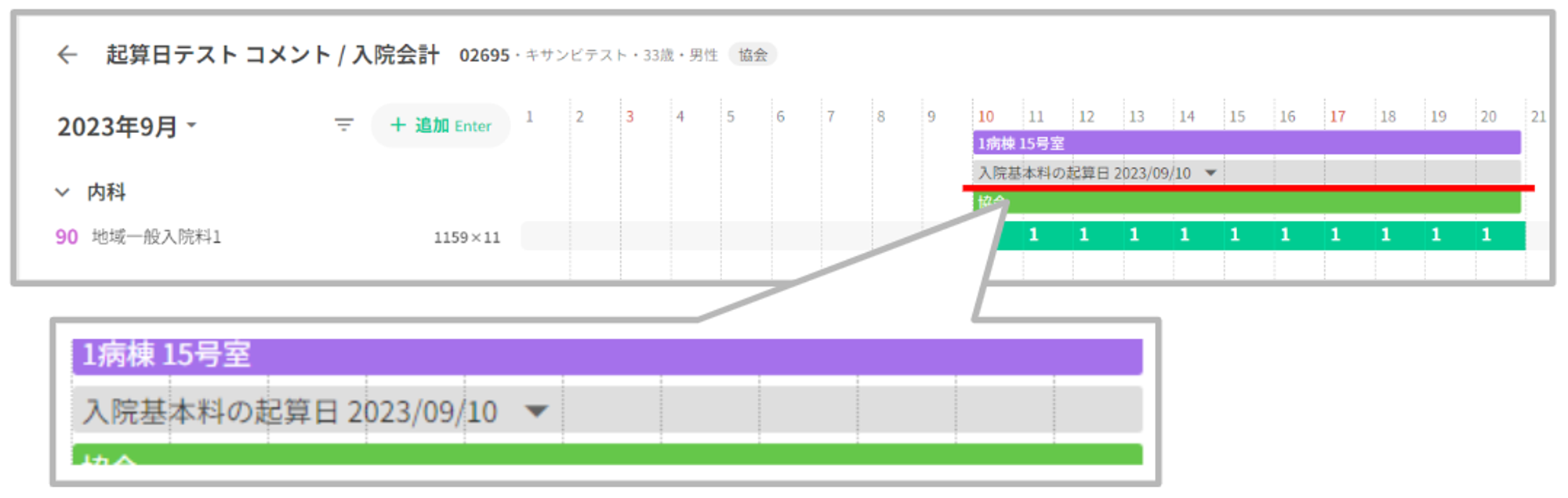 コスカレ上に表示されている移動歴情報バーと保険組合せバーの間に入院起算日バーがあります。。