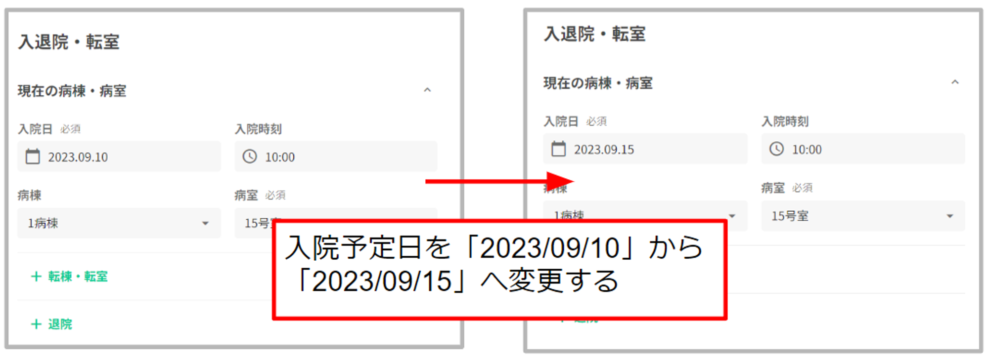 「入院起算日=当該入院日」と設定されている場合、入院日を変更すると入院起算日も変更した入院日と同日へ変更します。