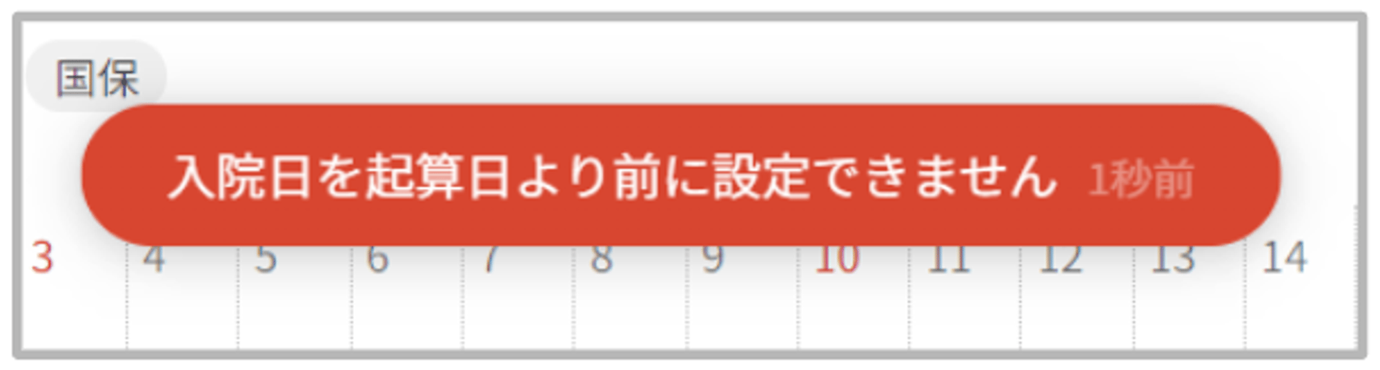 入院起算日を入院日翌日以降で設定しようとすると「入院日を起算日より前に設定できません」というエラーメッセージを表示したします。