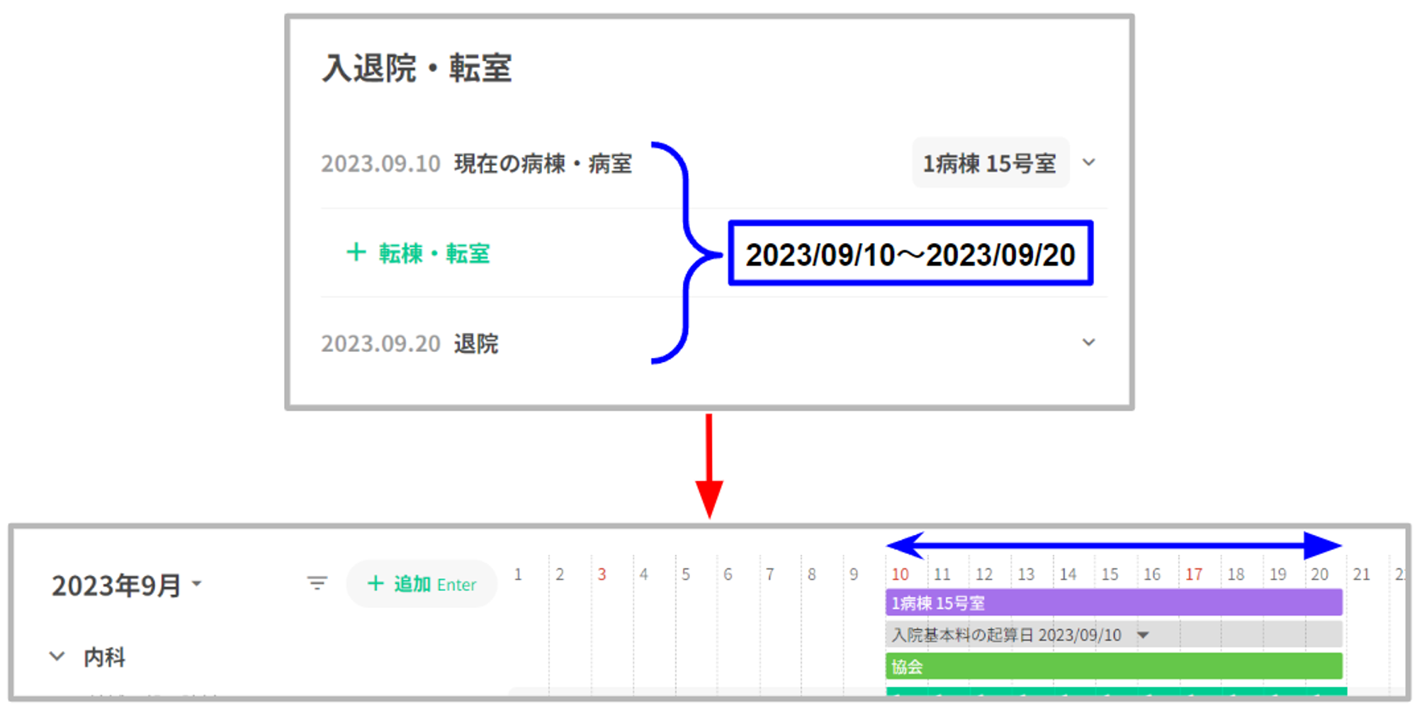 入院起算日バーは「入院起算日~退院日」までの期間で表示いたします。