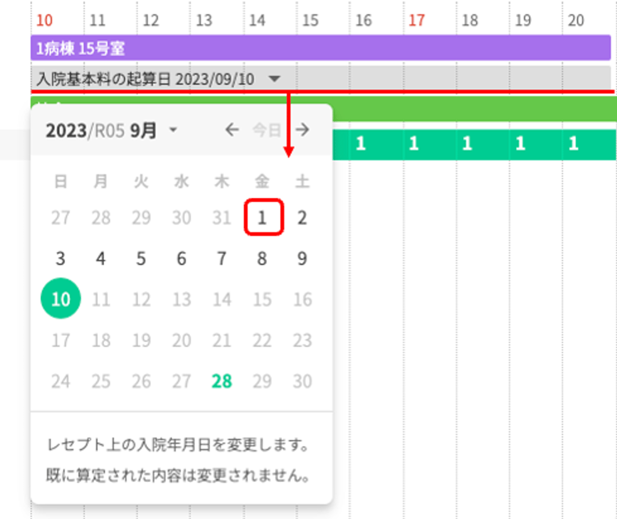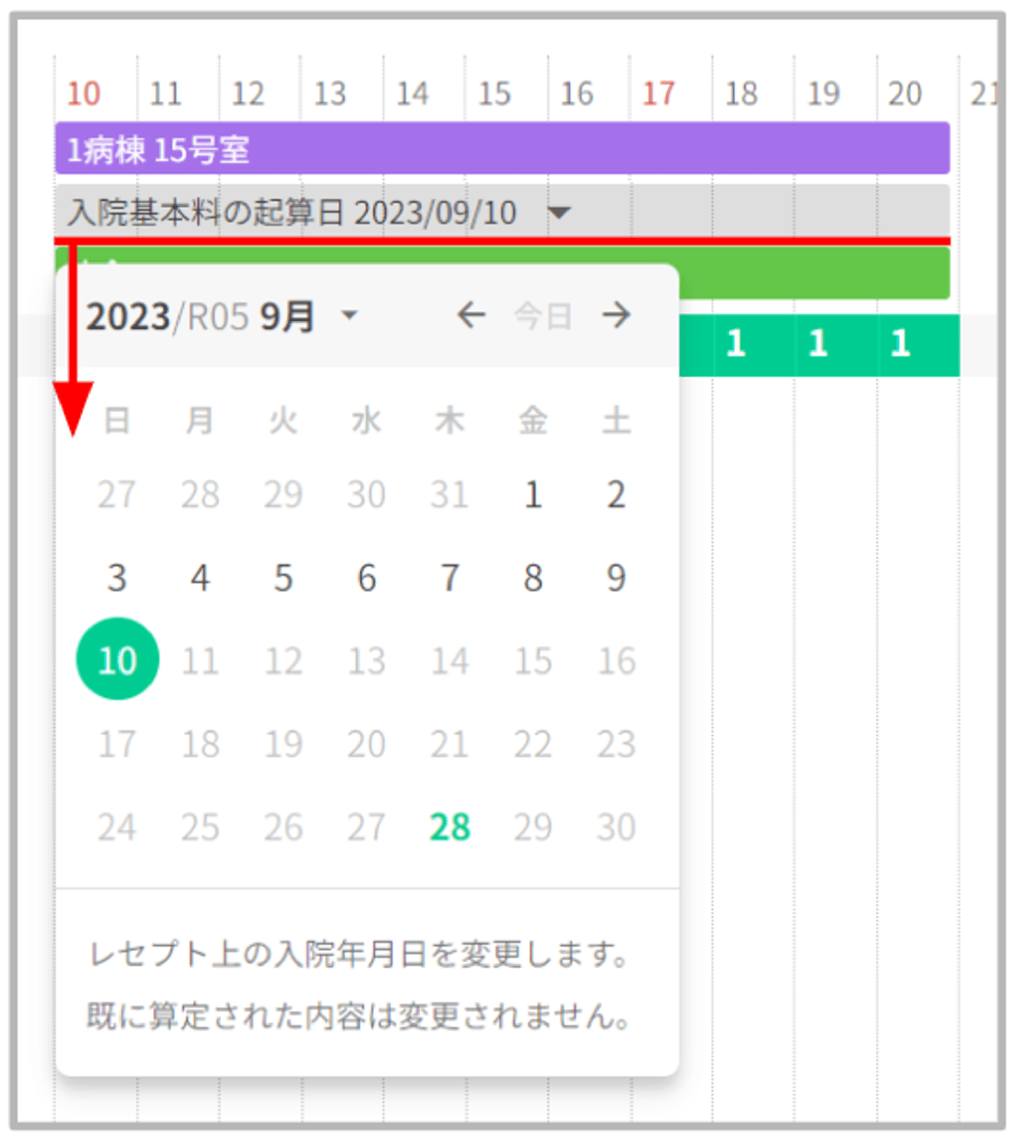 2. コストカレンダーにて入院起算日を「2023/09/01」に設定します