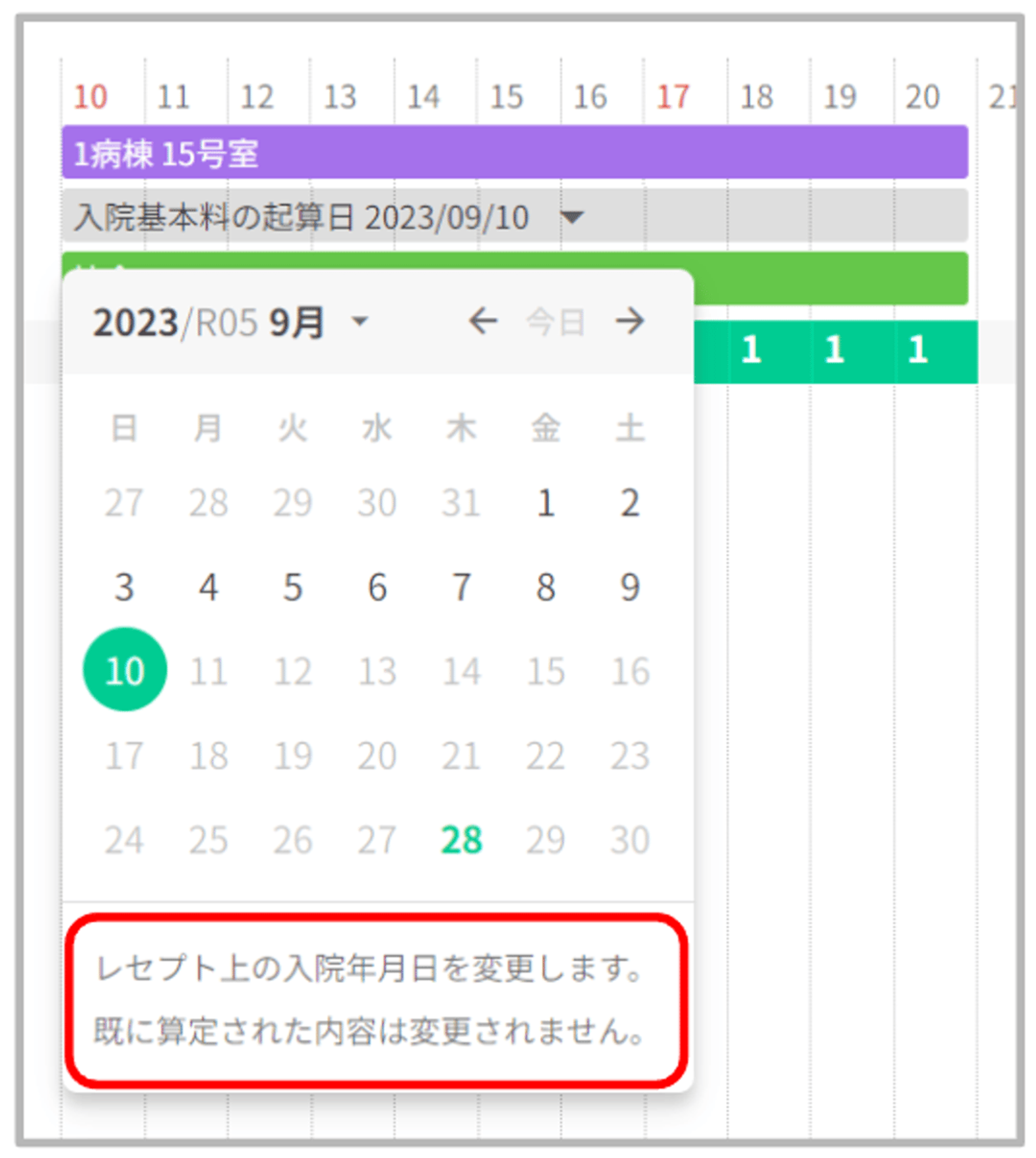 カレンダー下部に「レセプト上の入院年月日を変更します。既に算定された内容は変更されません。」という確認メッセージを表示いたします。