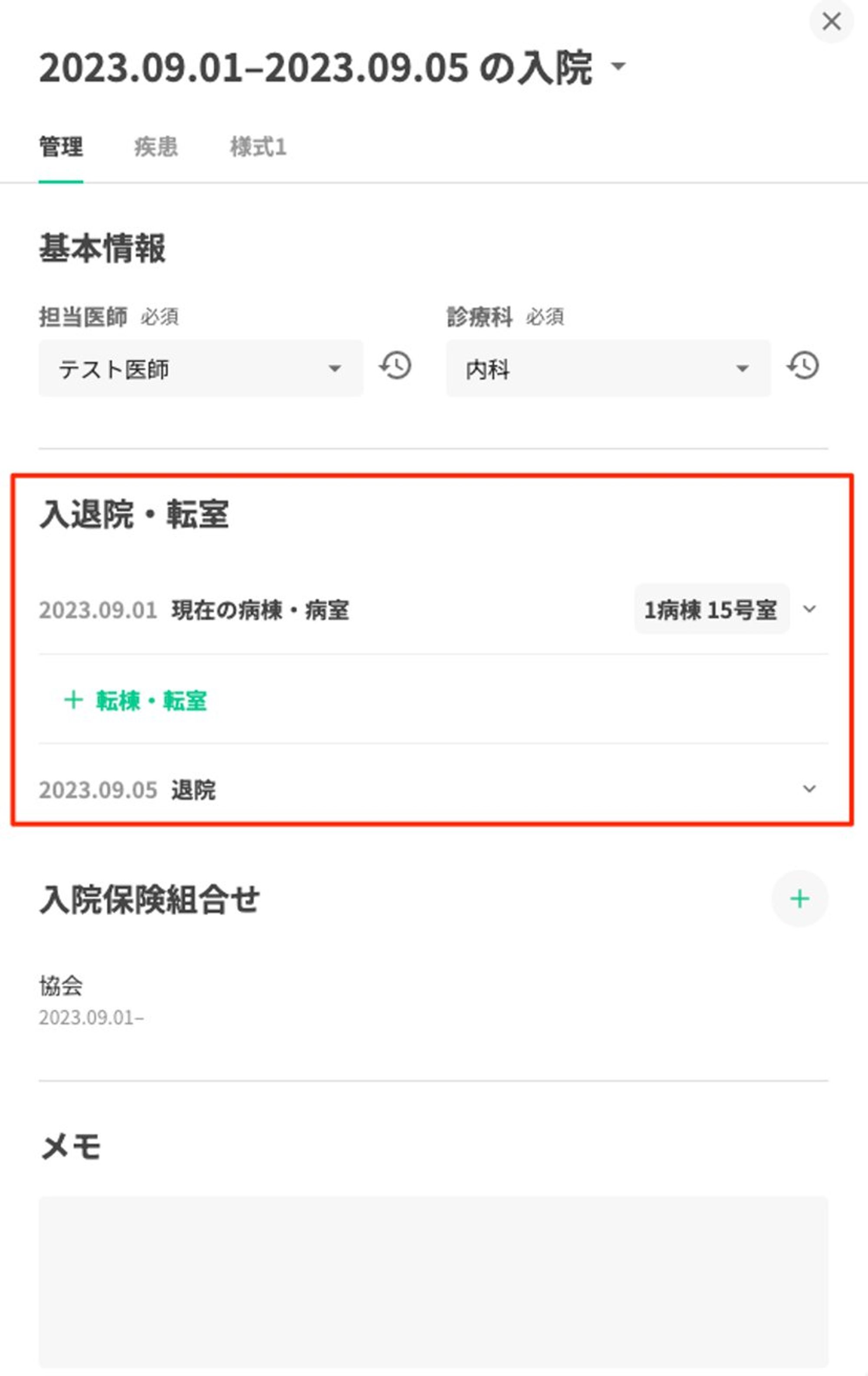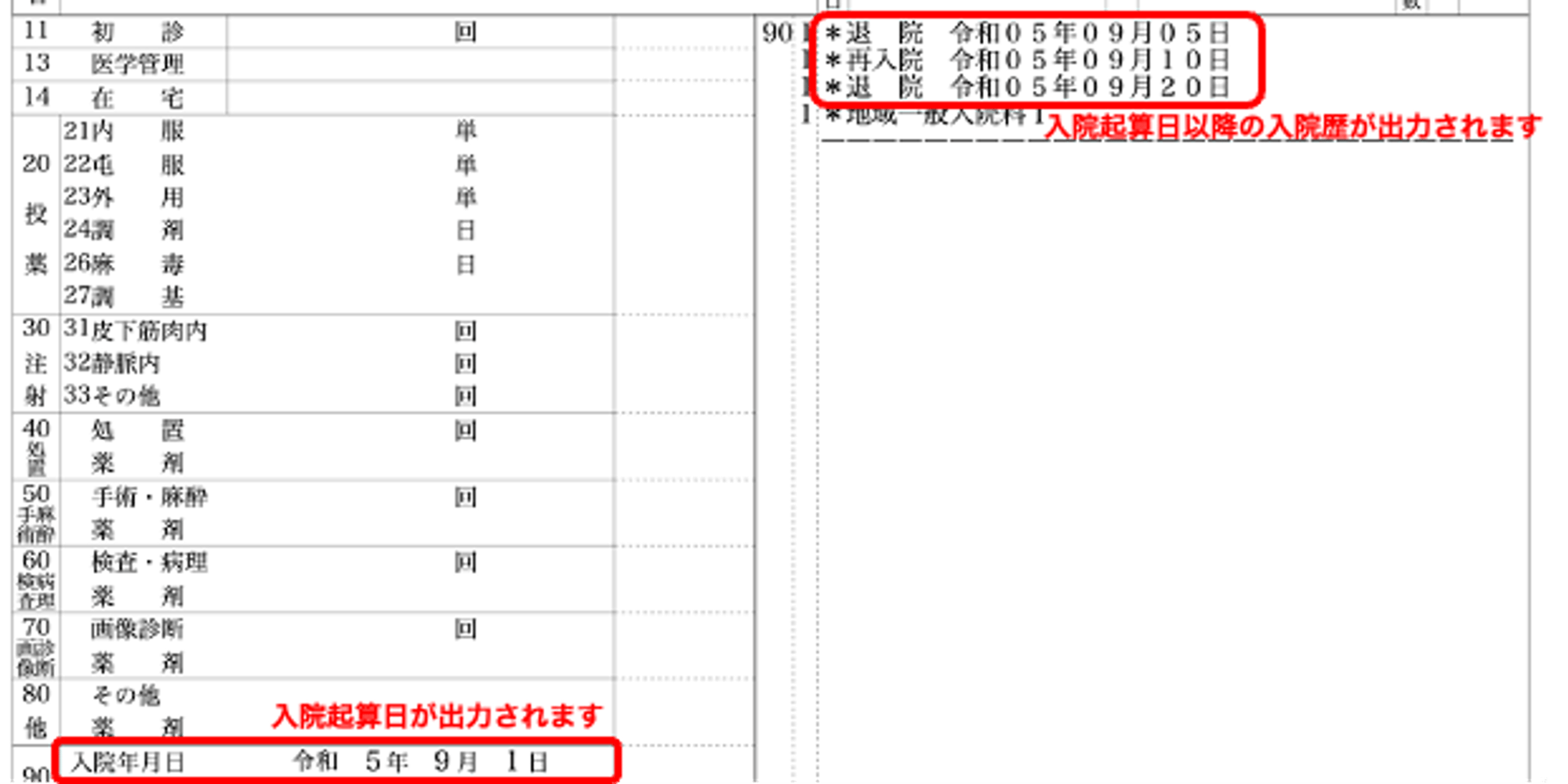 入院年月日に入院起算日である「2023年9月1日」、摘要欄に入院起算日以降の入院歴が自動で出力されます