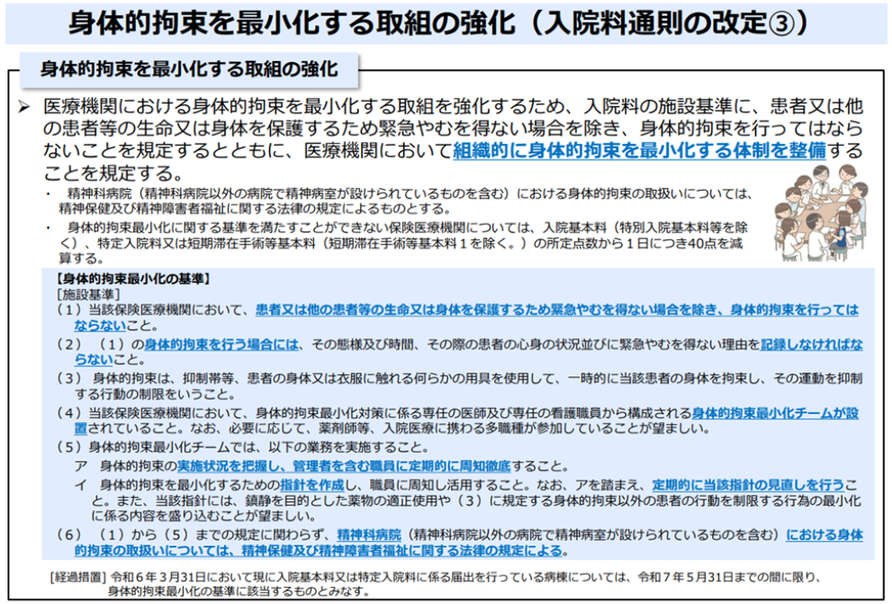 令和7年5月末で入院料「通則9:身体的拘束最小化の基準」の経過措置が終了します。