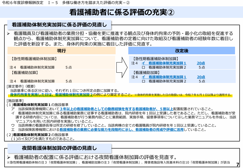 令和7年6月以降、以下の入院基本料等加算の加算として「看護補助体制充実加算1」を算定している場合に、身体的拘束を実施した日は「看護補助体制充実加算2」を算定する必要があります。