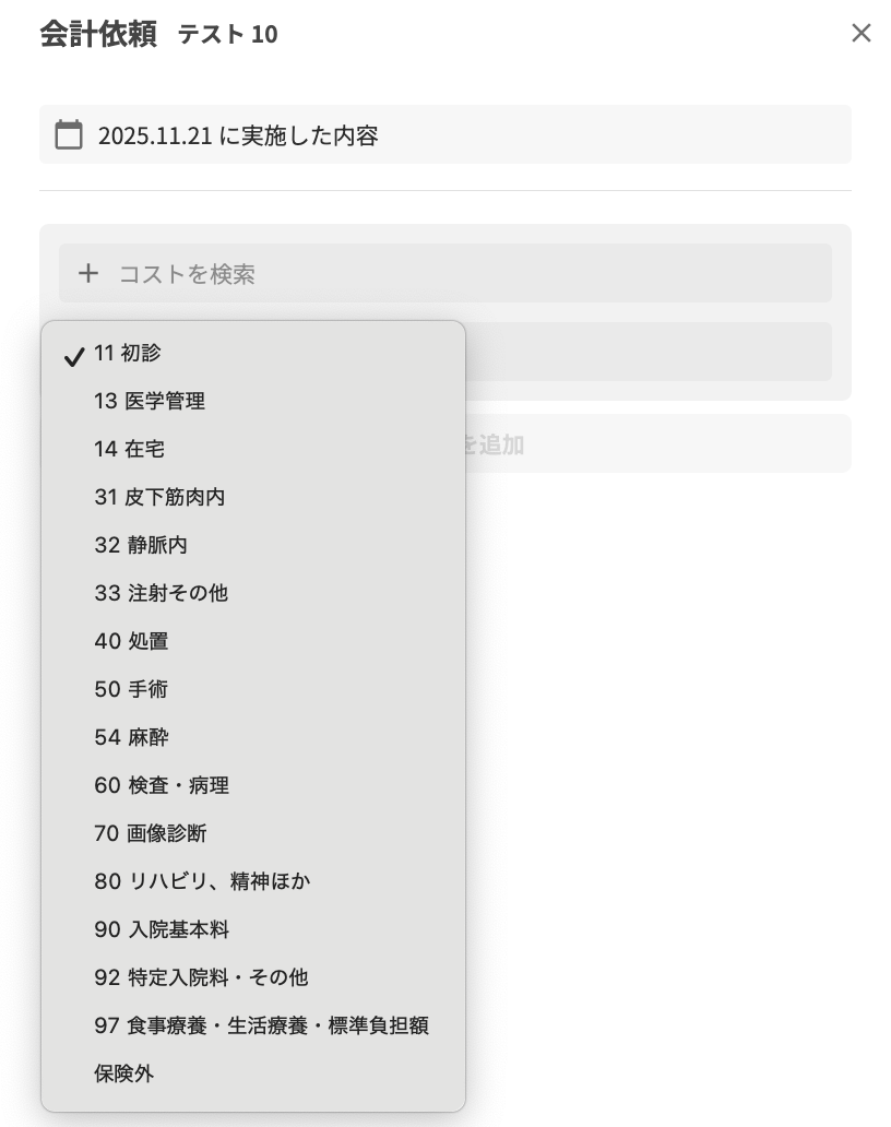 ※本機能は「実施したコストの記録」が目的であり、オーダー(指示機能)としての利用は推奨しておりません。会計依頼の入力と併せて、指示記録の記載をお願いします。