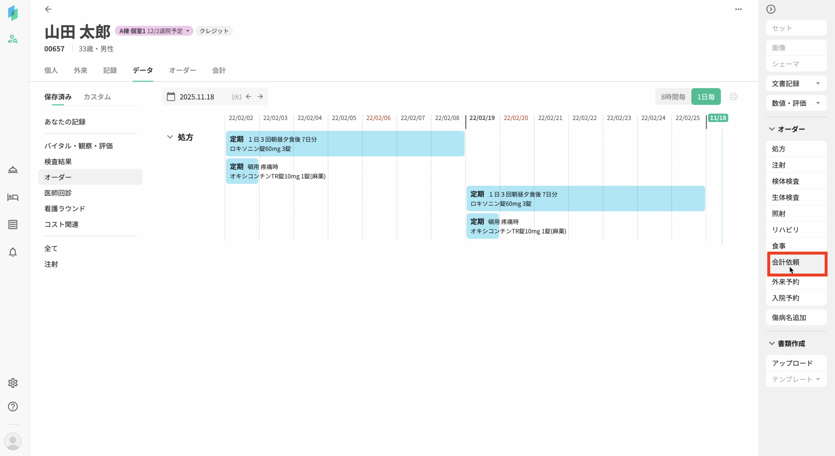 入院で実施した処置、医学管理料などを会計依頼にて入力
