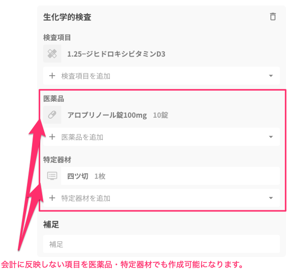 生体検査・検体検査オーダーの医薬品・特定器材の項目でも「会計に反映しない」を選択できるようになります。
