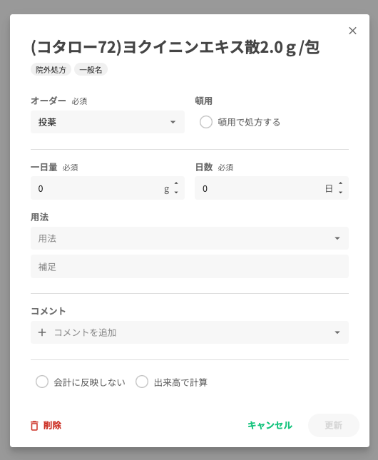 概要 検査オーダーの全ての項目について「会計に反映しない」を選択できるようになります。 本変更に伴い、臨床側の会計に係る項目の見直しおよび文言等を変更しています。