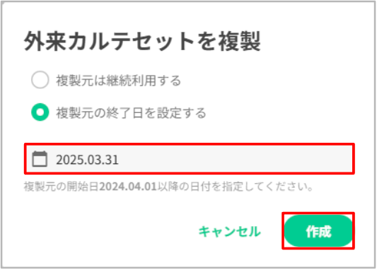 3.終了日に「2025/3/31」を入力し、「作成」を押下します。