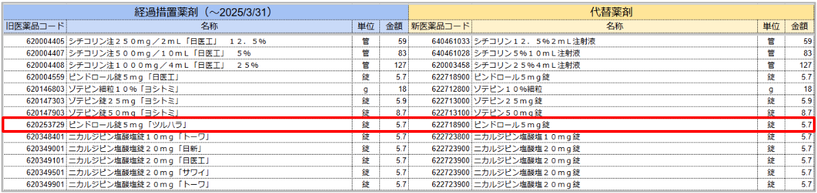 5.代替薬剤の一覧から廃止薬剤に該当する代替薬剤を確認します。