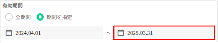 ※1 有効期間が指定されておらず「全期間」になっている場合は、「期間を指定」に変更すると開始日に本日の日付が自動的に反映しますので、開始日は空白または任意の過去日を指定いただきますようお願いいたします
