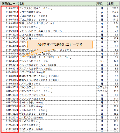2.医薬品マスタ一覧の「代替薬剤」シートを開き、旧医薬品コード列(A列)をすべて選択しコピーします