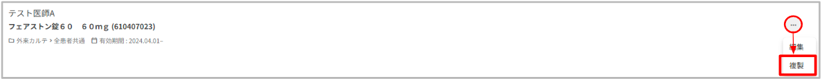 1.修正する外来カルテセットの右側にある「・・・」を押下し「複製」を選択します。