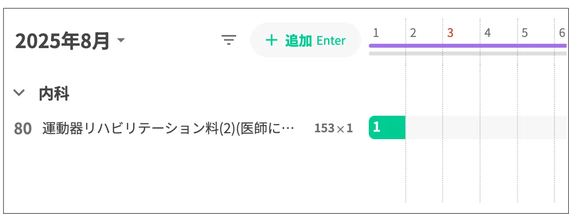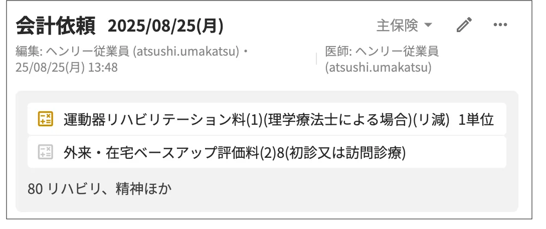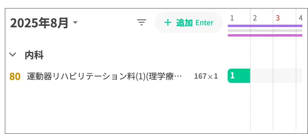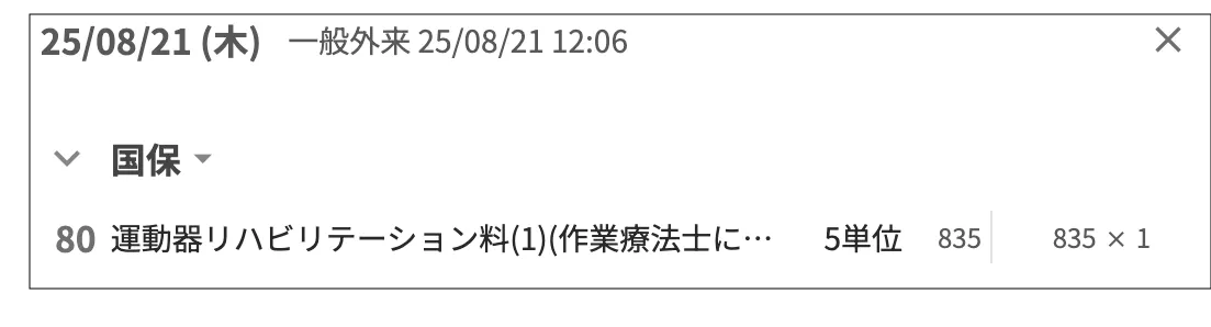 外来会計の画面 診療識別80(80 リハビリ、精神ほか)は濃い灰色の数字で表現