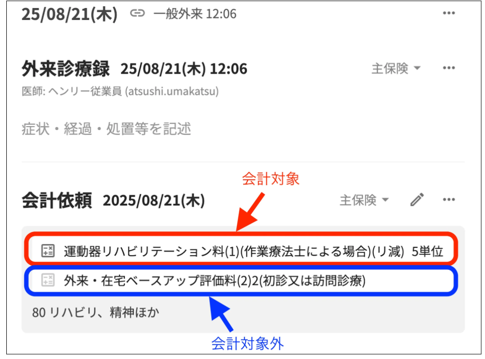 外来診療の画面 診療識別80(80 リハビリ、精神ほか)の会計対象かどうかは濃淡で判断が必要