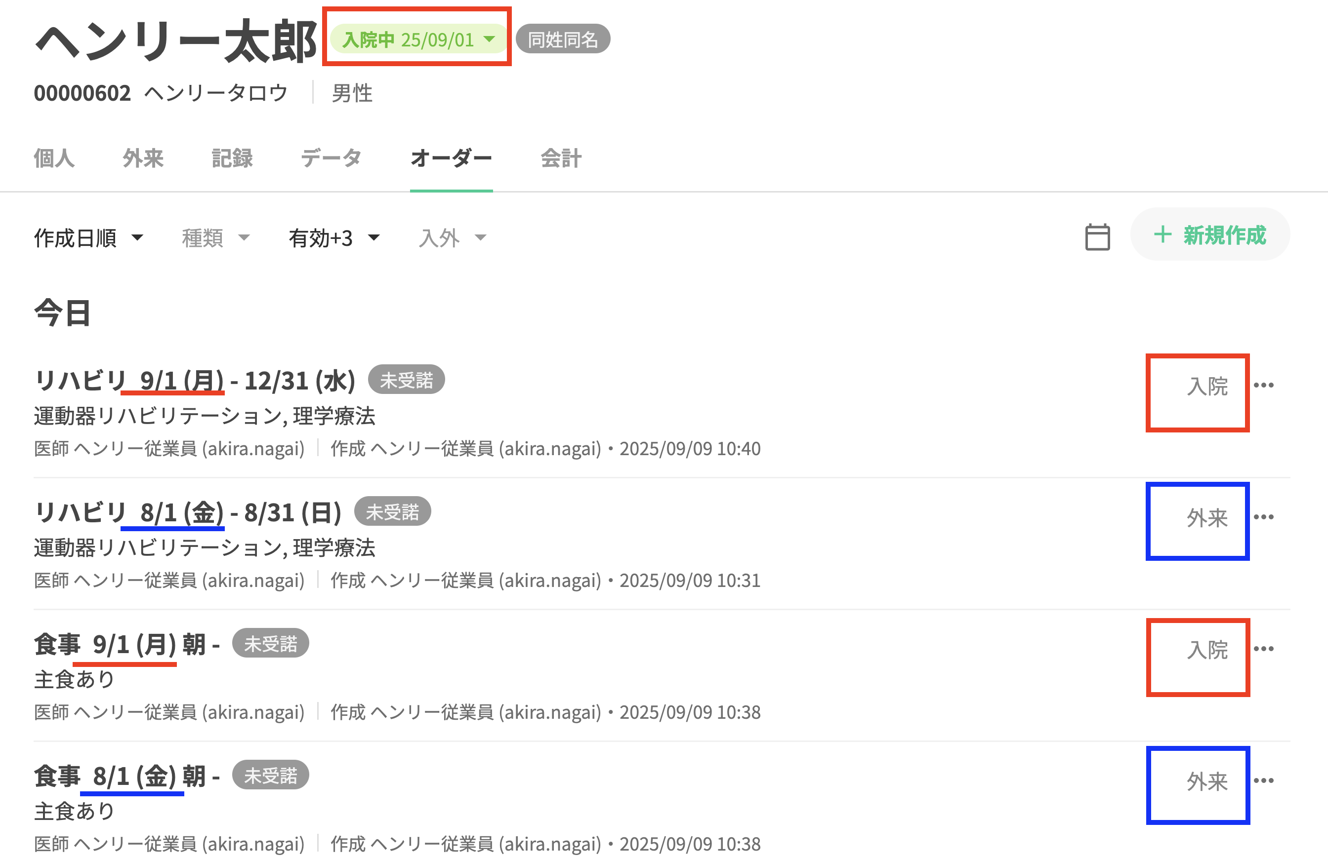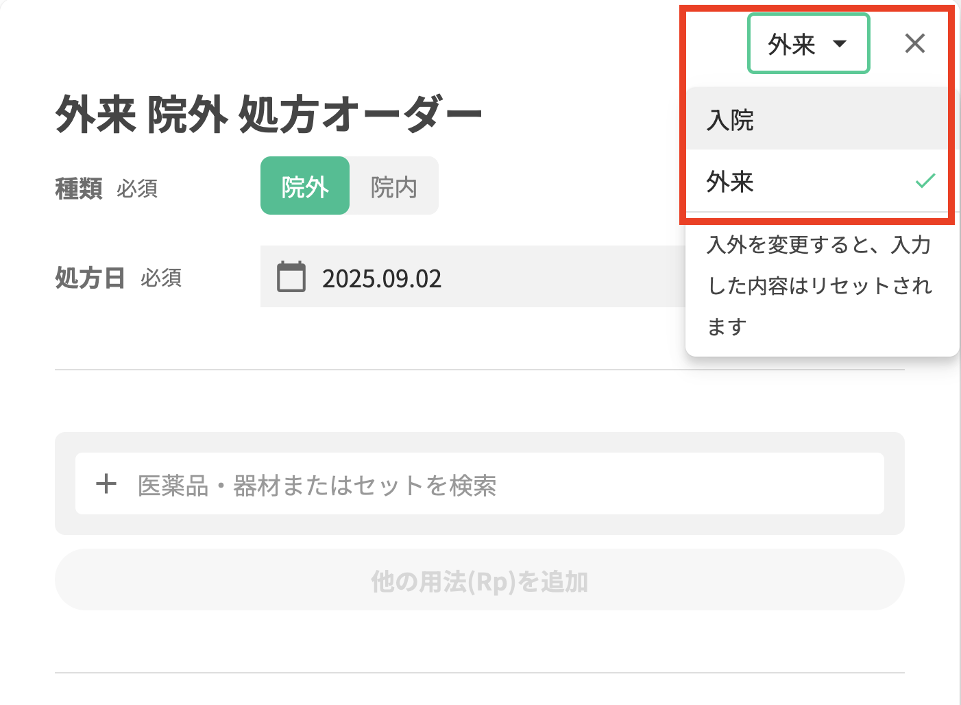 オーダー作成時に選択する入院・外来の種別が反映されます