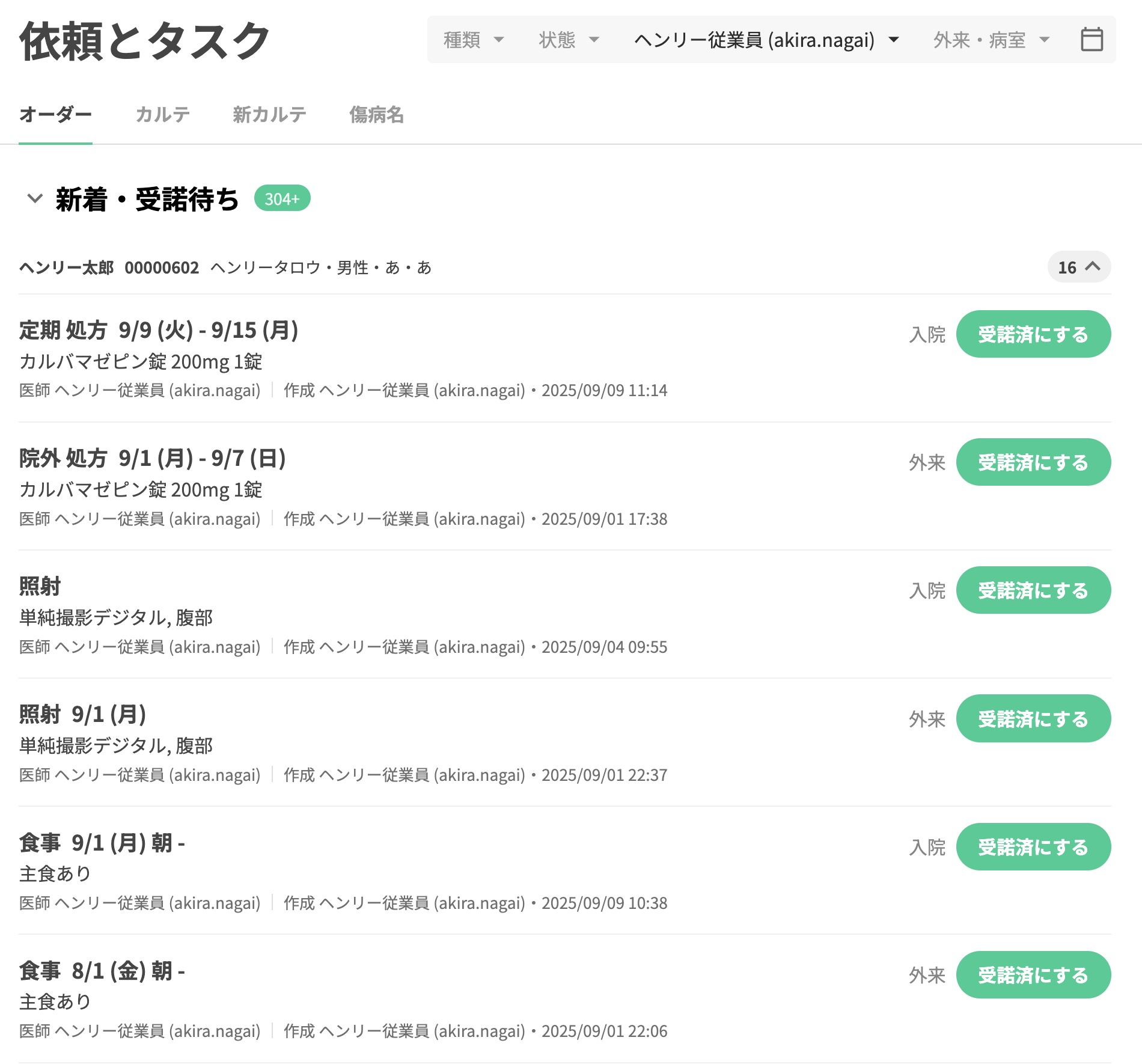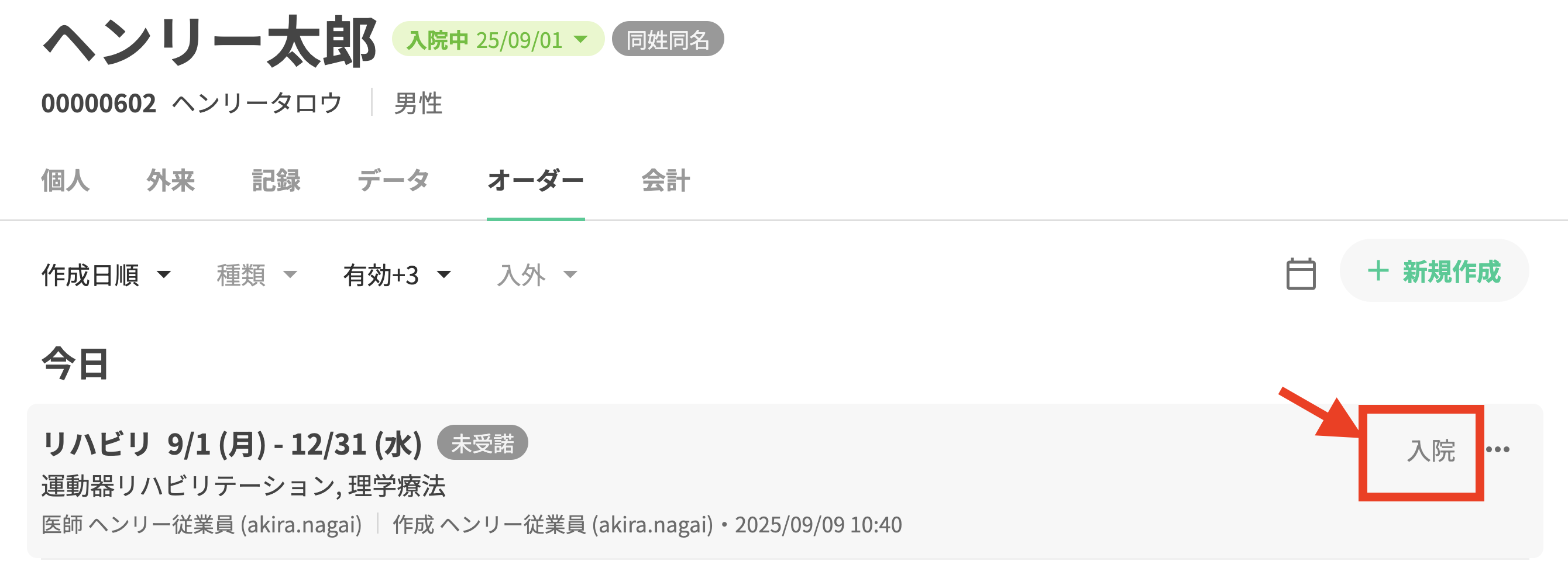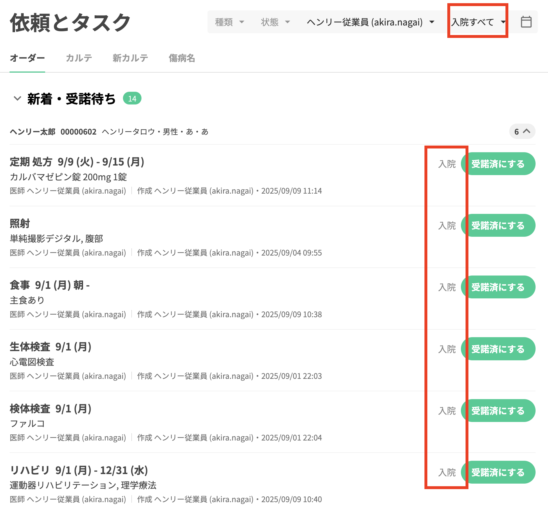 「入院」を明示しているオーダーは、フィルタ「入院」で表示します