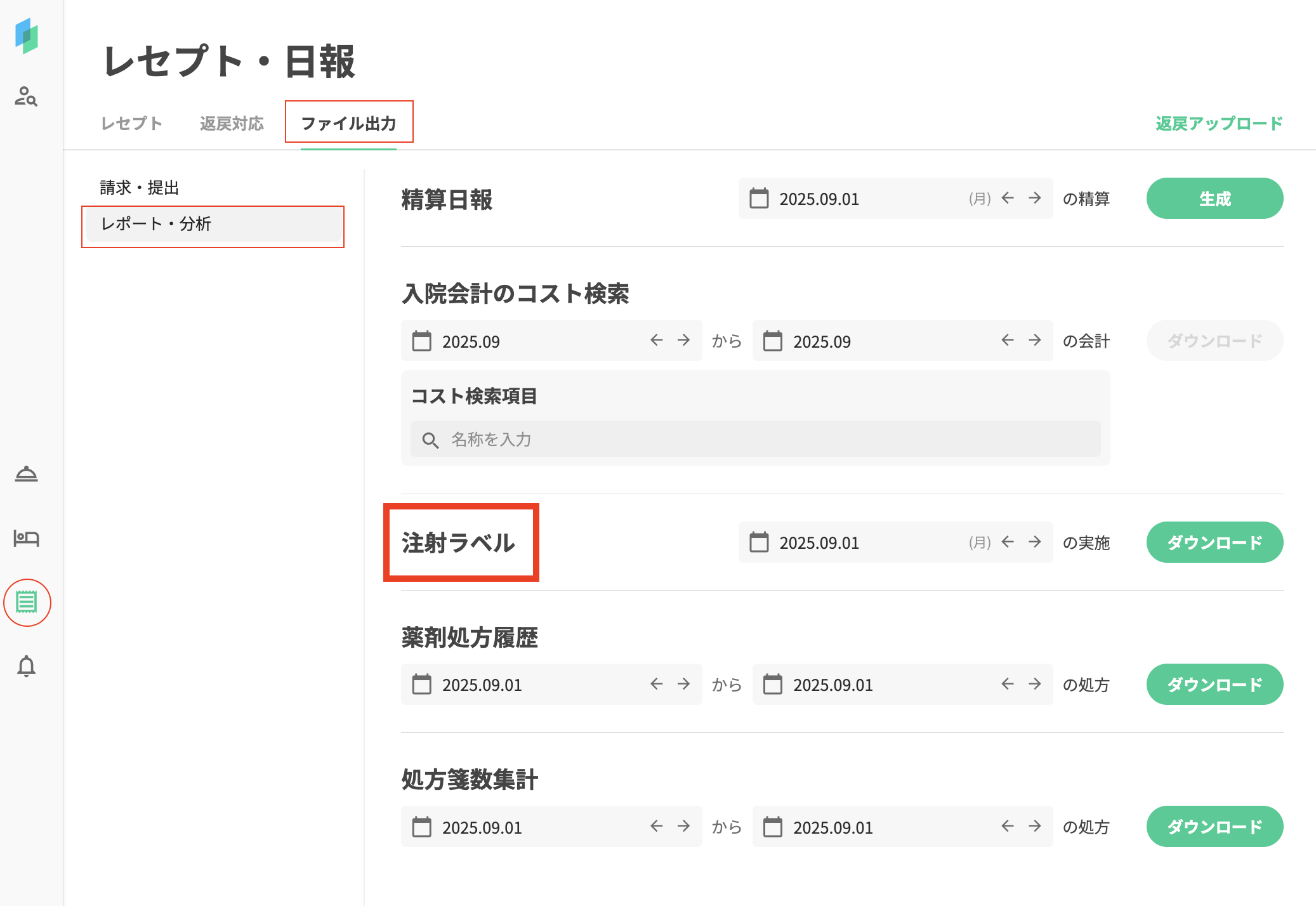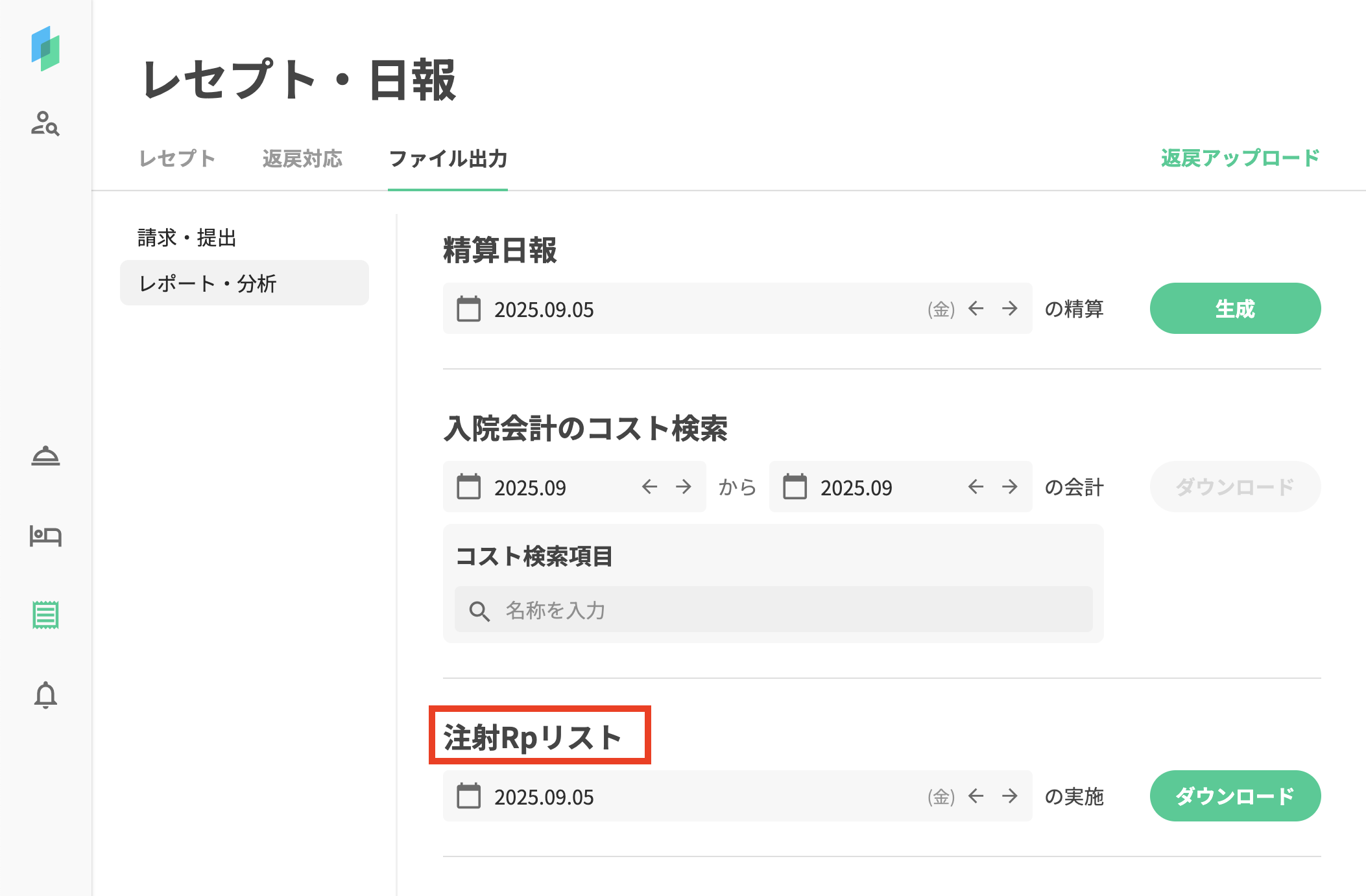 レセプト・日報>ファイル出力>レポート・分析の「注射ラベル」の名称を「注射Rpリスト」に変更します