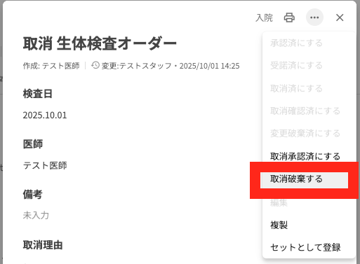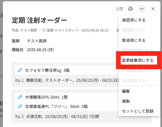 スタッフアカウントでオーダーを変更・取消すると、医師に承認依頼が送られます。その際に医師はその変更を破棄する・取消を破棄する(=スタッフが変更する前の状態に戻す)ことができました。