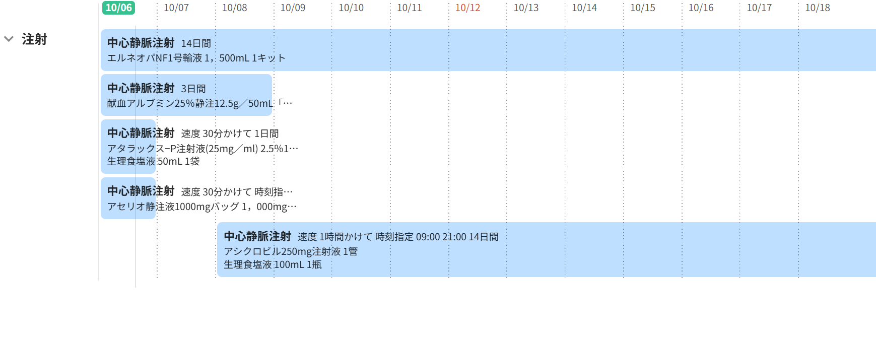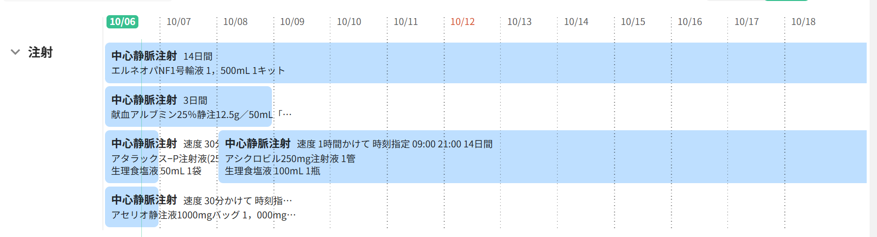 今後は、オーダーの入力方法に関わらず新しい処方・注射Rpは別行に追加され、開始日が早いものから順に表示されます。