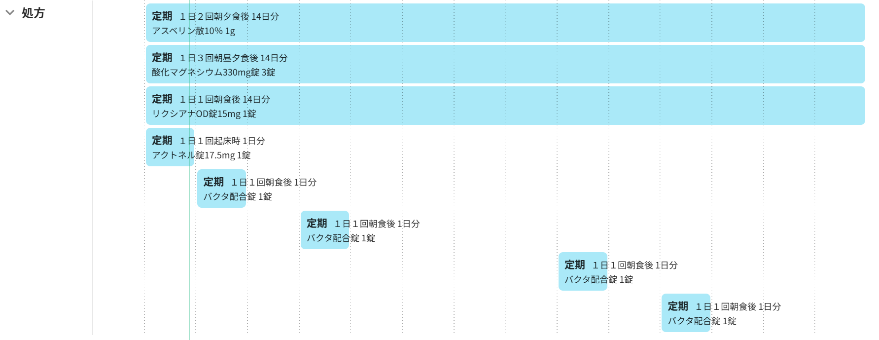 週1回内服のアクトネル錠を独立したオーダーで処方した場合、週2回内服のバクタ配合錠が同一行に横並びで表示されていました。
