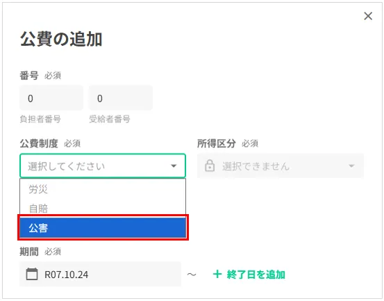 公害登録を行った患者様は、会計画面の保険組み合わせで「公害」を選択できます