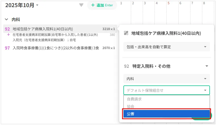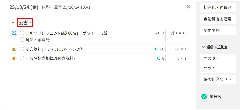 公害登録を行った患者様は、コストカレンダーの保険組み合わせで「公害」を選択できます