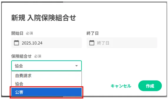 公害登録を行った患者様は、入院保険組み合わせで「公害」を選択できます