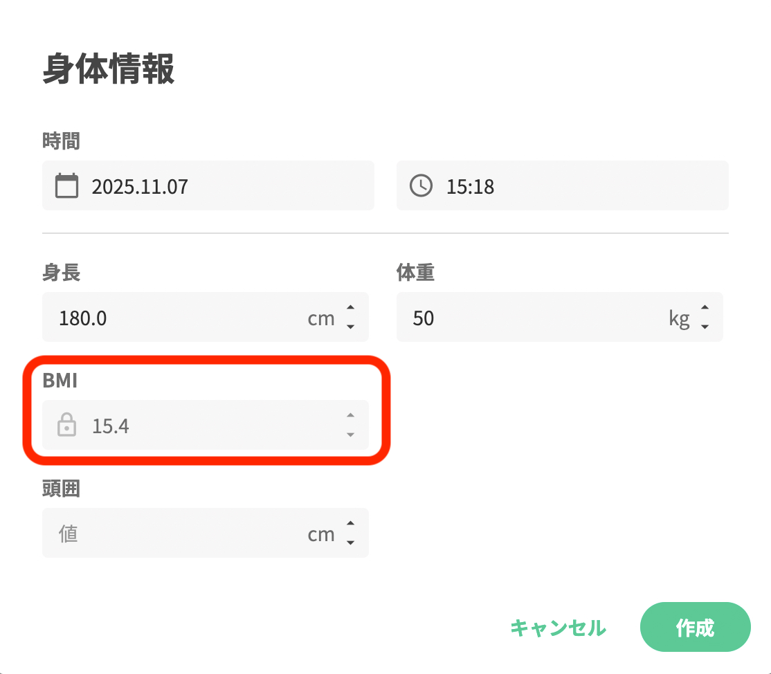 身長・体重を基に、BMIが自動計算されます
