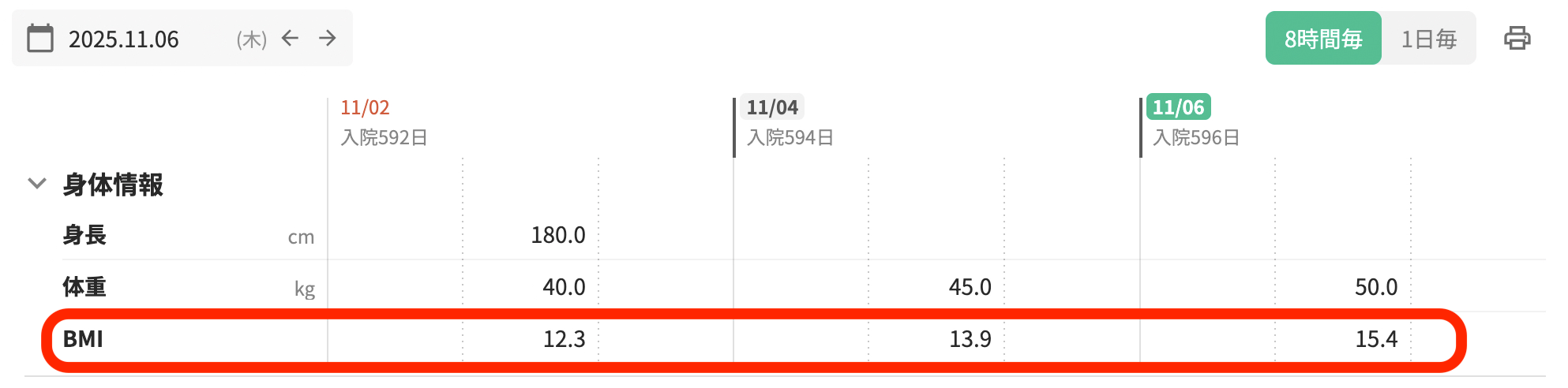 データタブ上にもBMIが表示され、時系列で確認ができます