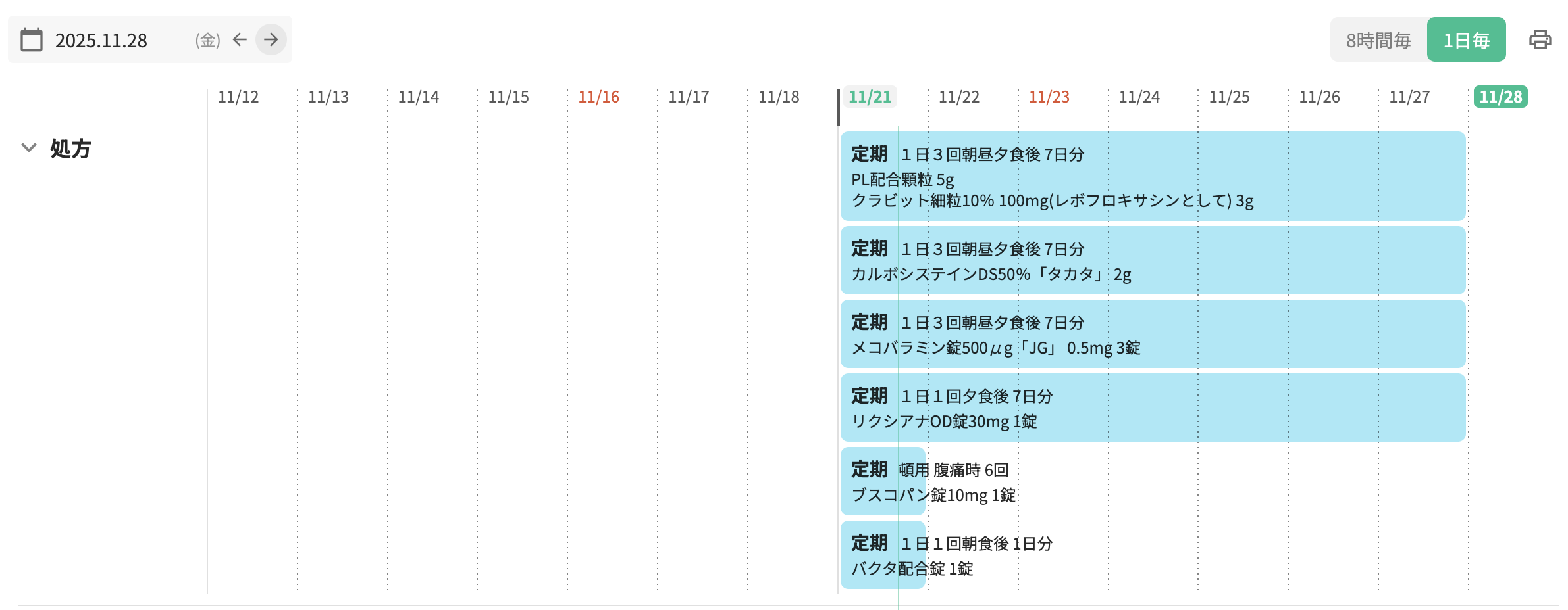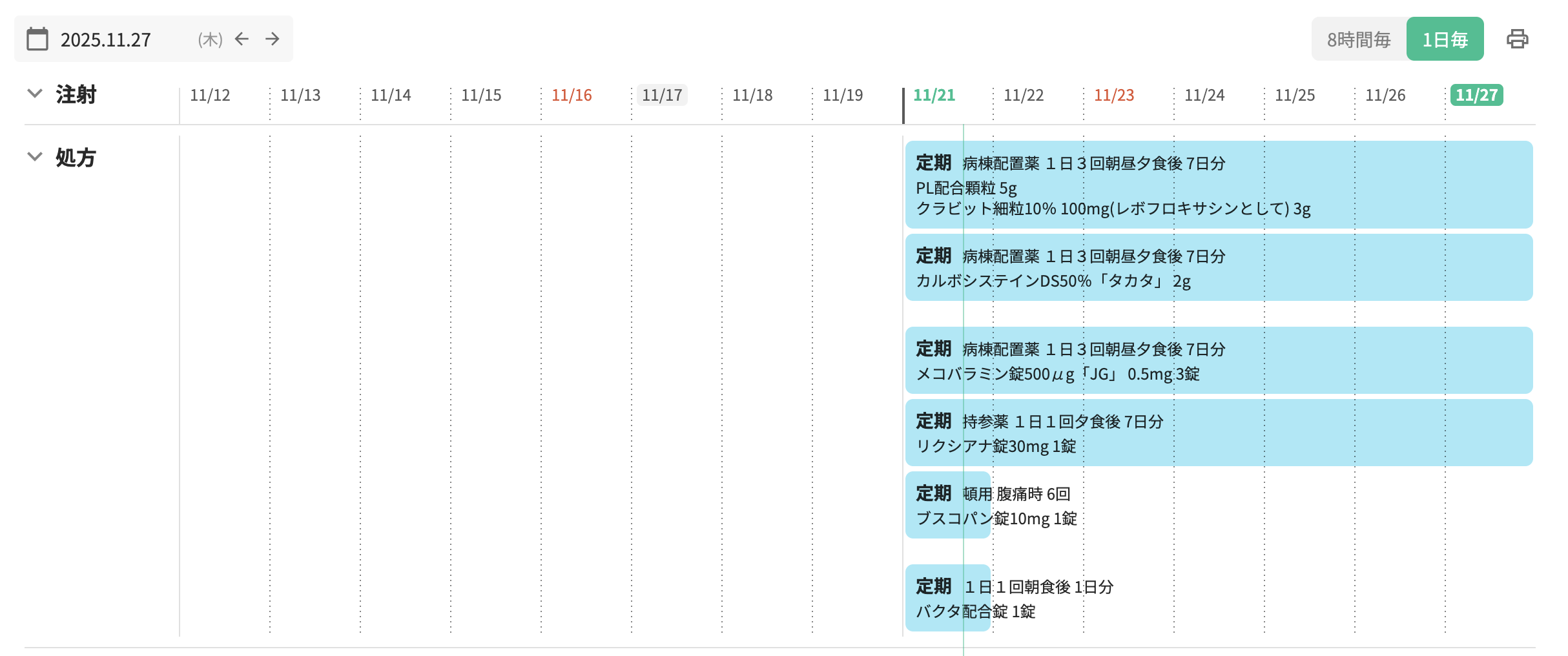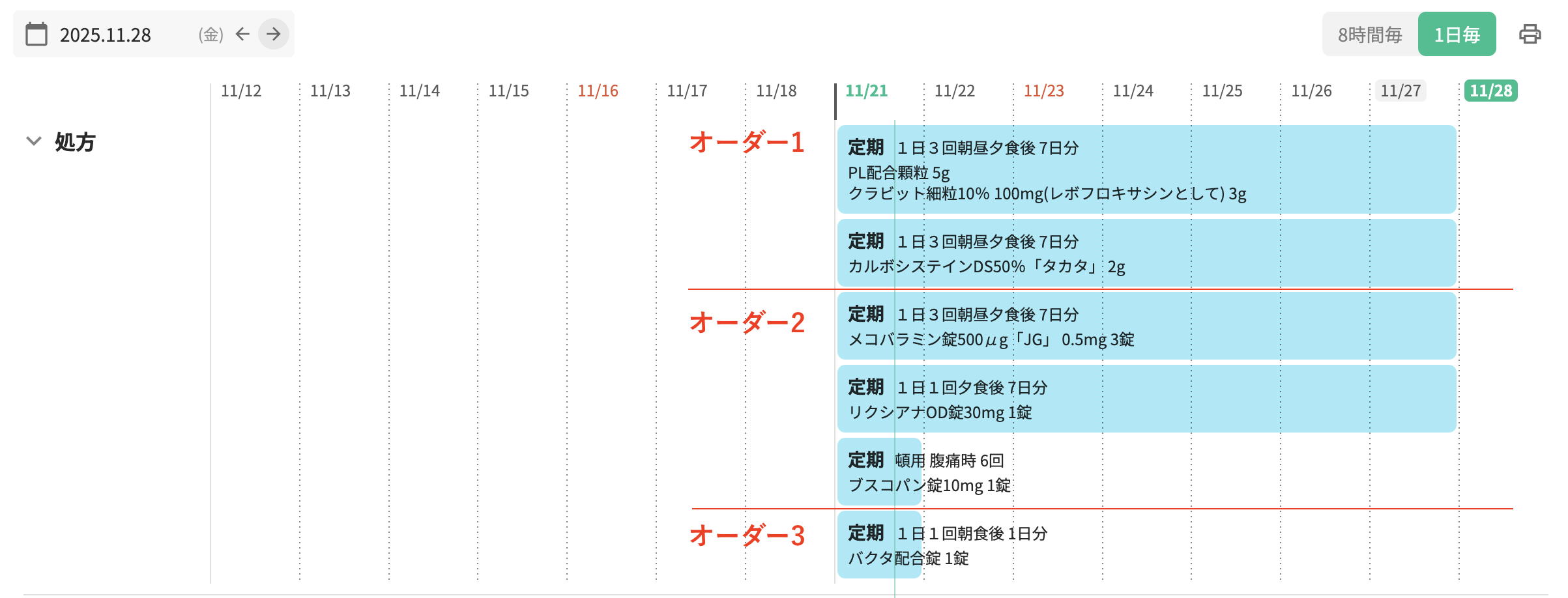 カレンダービューの処方・注射オーダーはRp単位で表示されており、余白も均一なため、オーダーの境目を認識することができませんでした