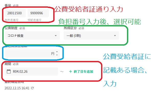 ⑴「公費」右上の「+」をクリックして保険編集画面を開き、公費受給者証にの保険情報を入力します。