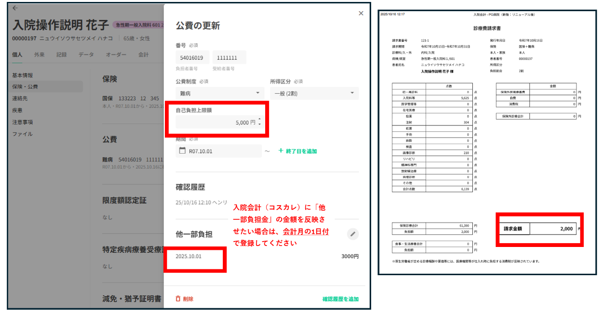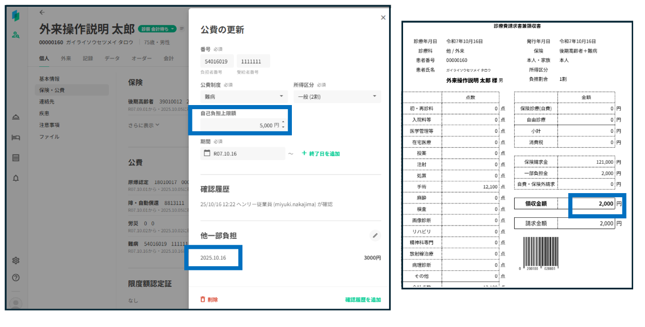 日付欄に他院受診日・金額欄に他院での自己負担額を入力する