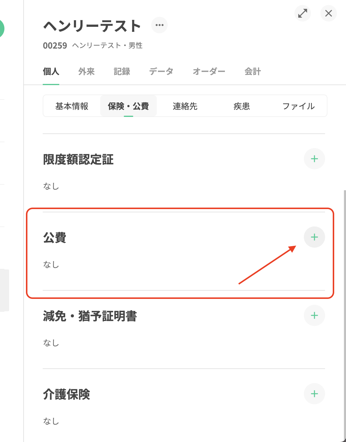 1.「公費」右上の「+」をクリックして公費編集画面を開きます。