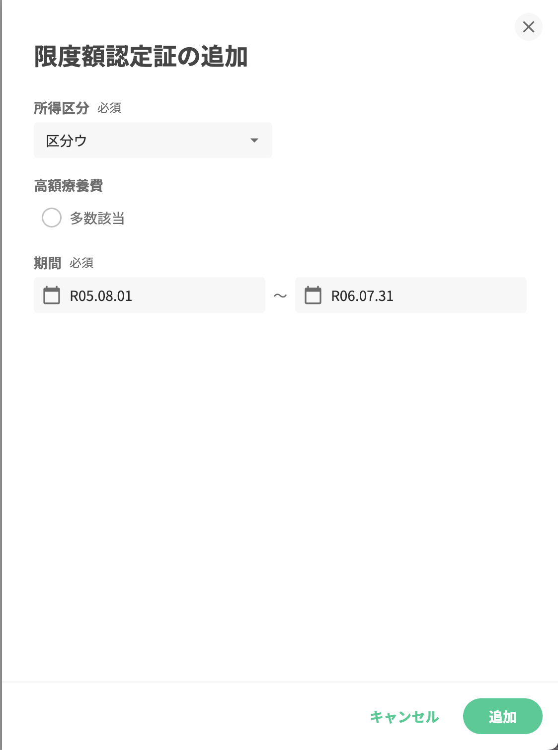 5.公費受給者証の適用区分(ヘンリーでの項目名は所得区分)と有効期間を入力します。有効期間は公費の受給者証にならってください。