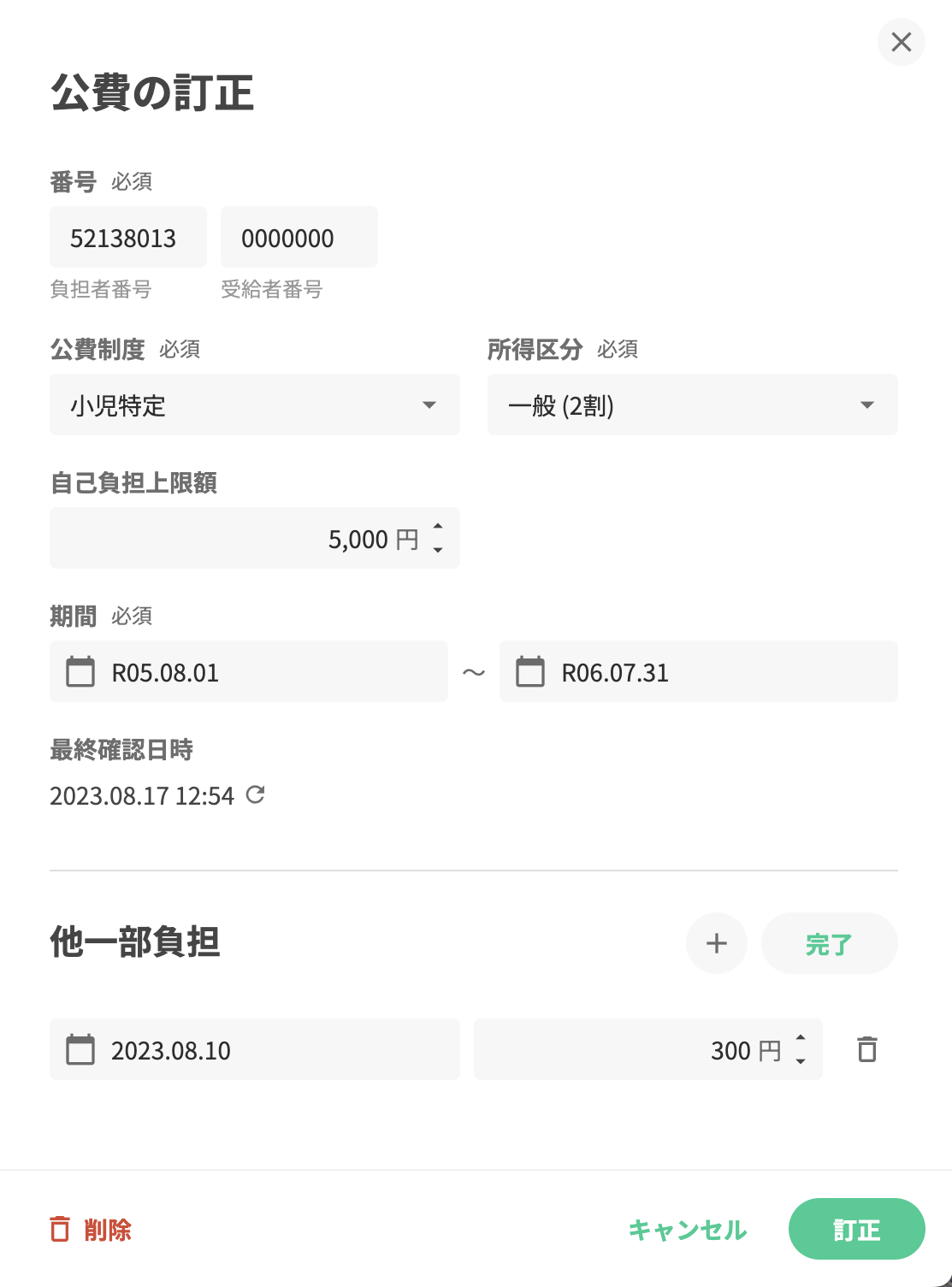 2.公費受給者証の情報を入力します。他医療機関分の自己負担額を他一部負担に登録します。