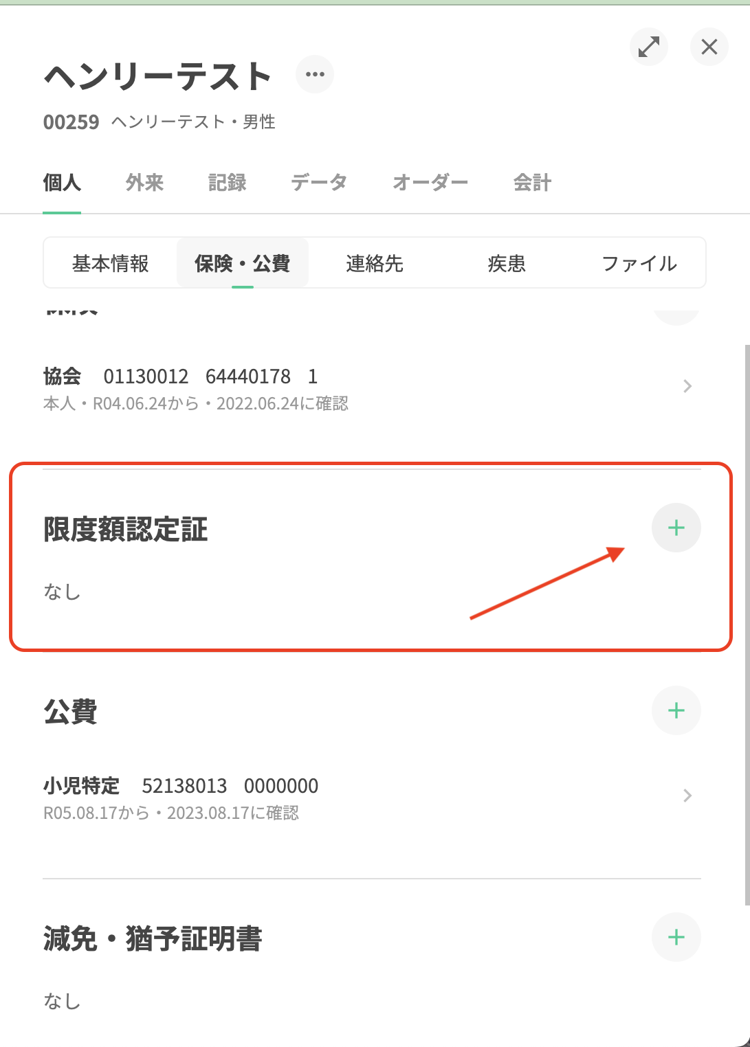 4.「限度額認定証」右上の「+」をクリックして編集画面を開きます。