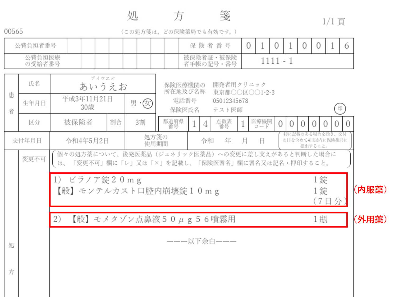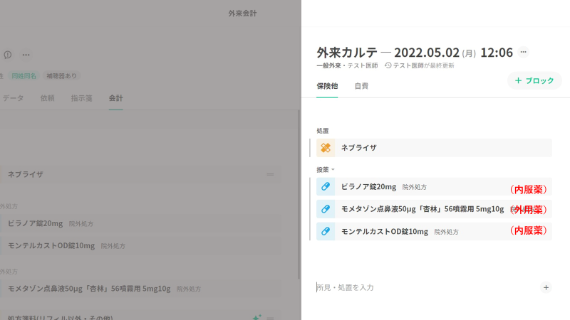 内服・外用の順にまとまるので、カルテ上で内服薬と内服薬の間にある外用薬は、処方箋上では内服薬のまとまりの下に移動します。