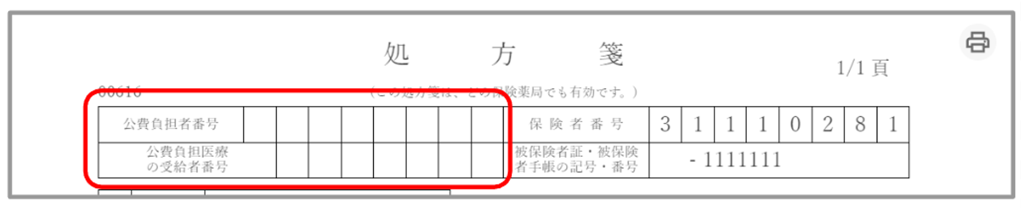 処方箋の公費番号欄は、「負担者番号:8桁・受給者番号:7桁」となっています。