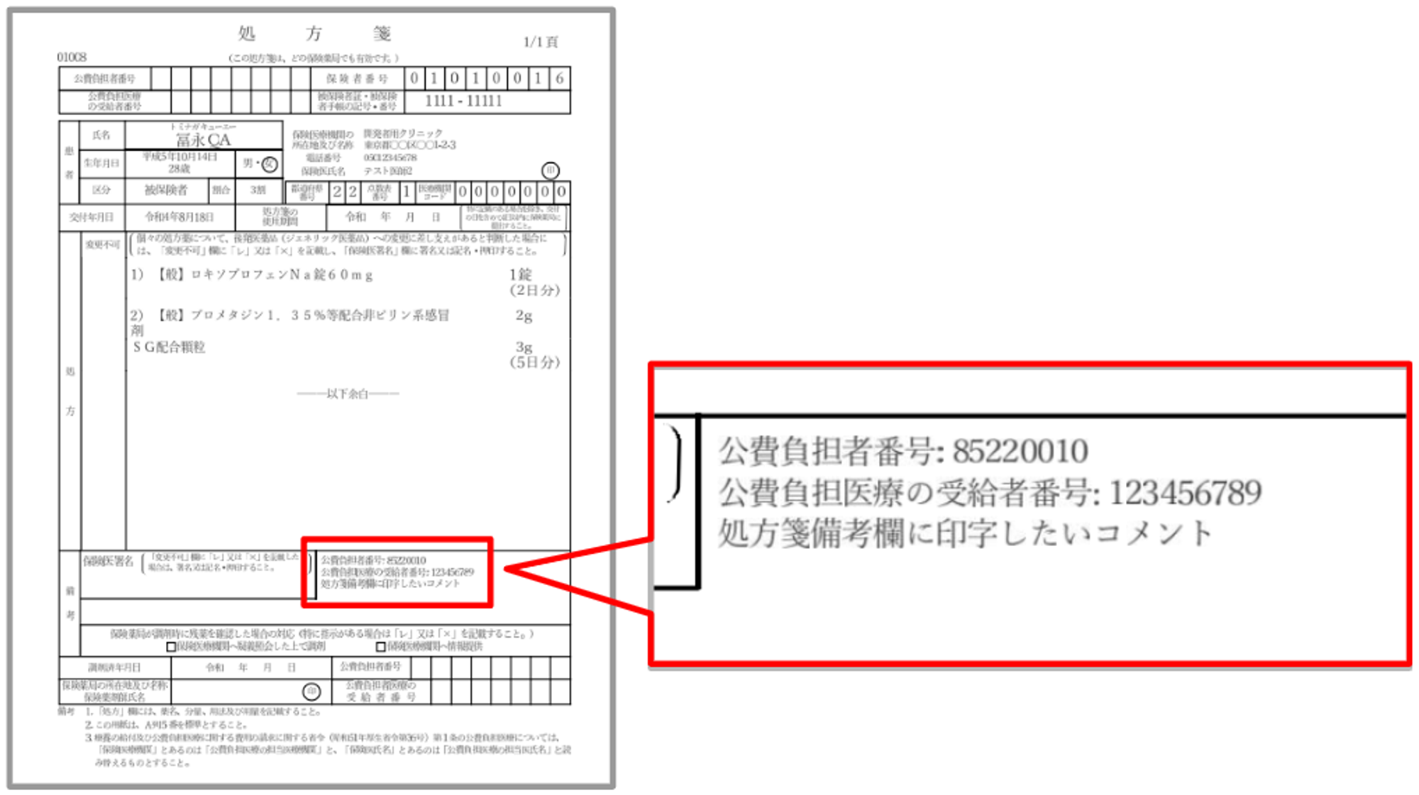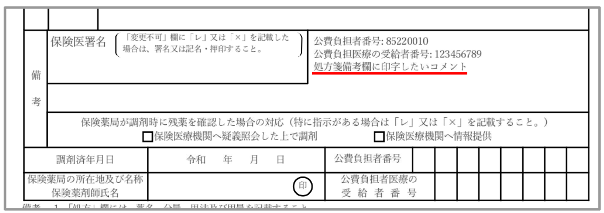 2.医薬品の備考コメントがある場合は、公費の負担者番号・受給者番号に続けて備考欄の最下部に印字されます。