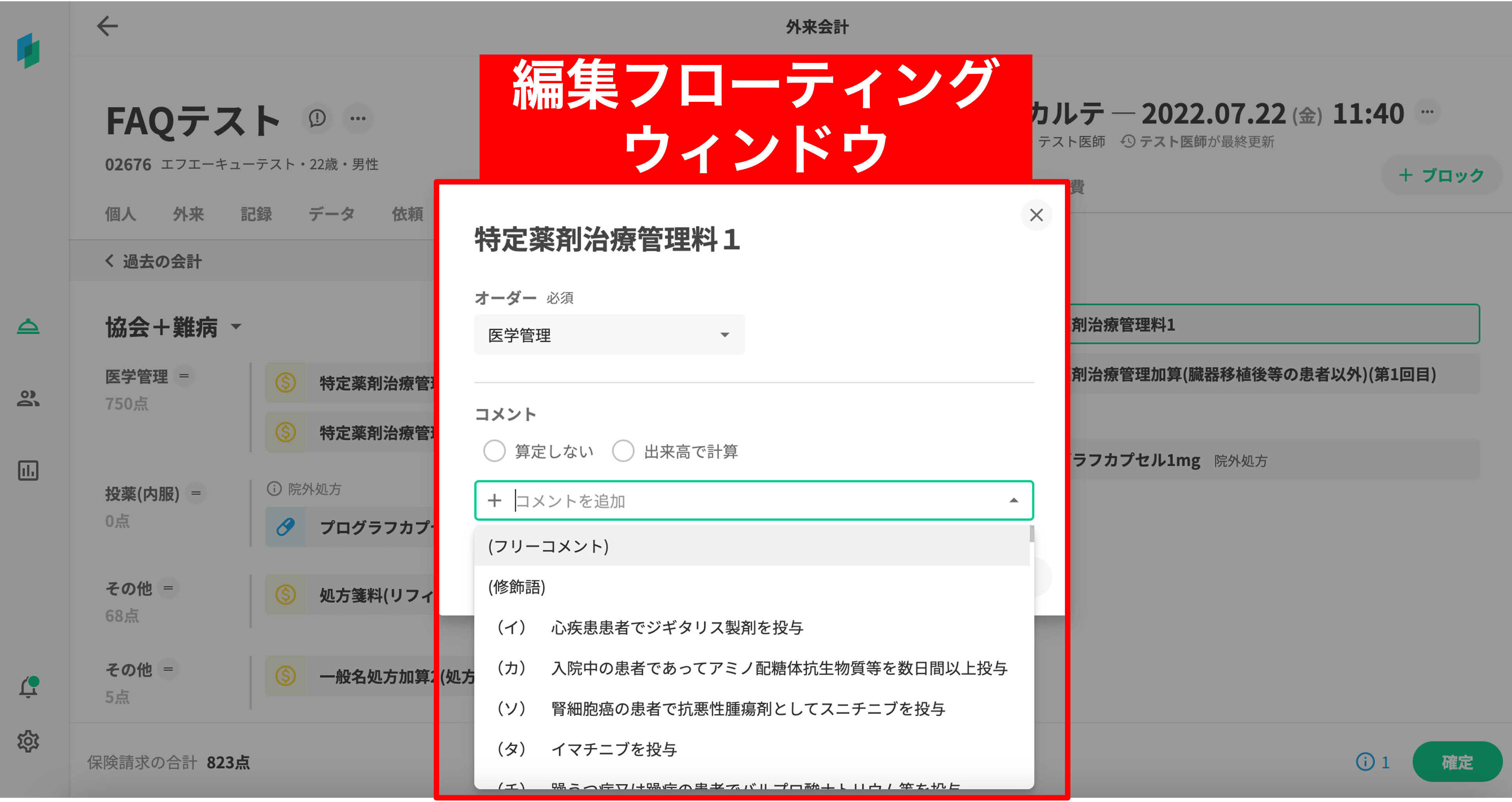 会計画面を開き、会計編集画面からコメントを追加したい処置行為ブロックの編集フローティングウィンドウを開きます。