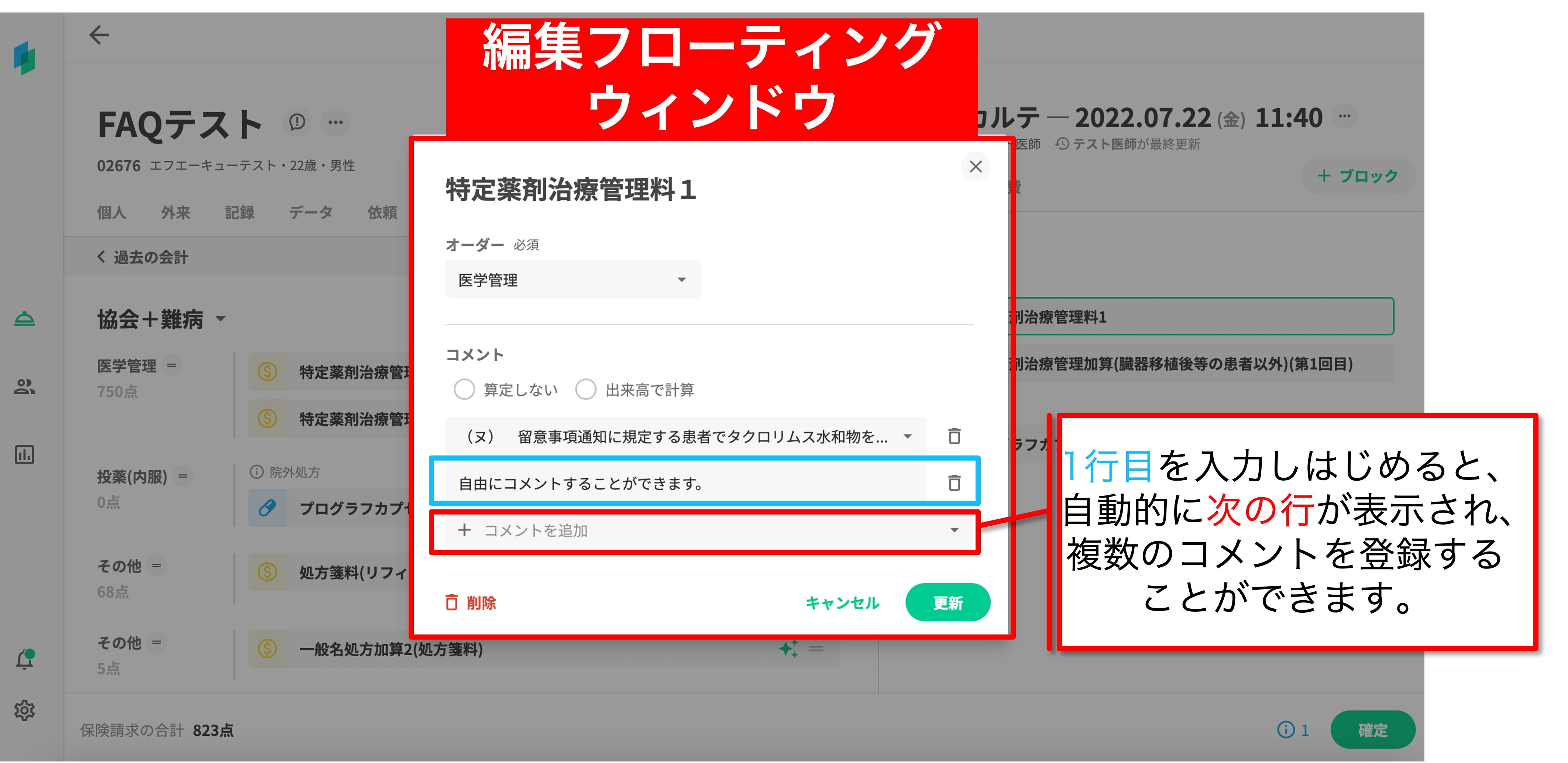 特定の処置行為について、算定上・診療上の補足事項を付しておきたい場合、コメントを記載することができます。