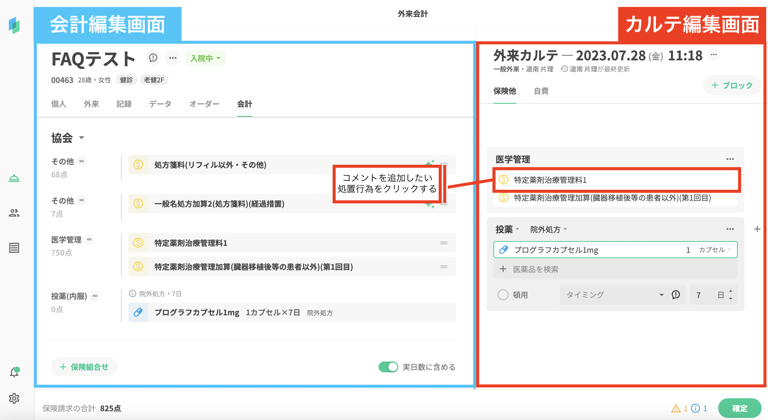 コメントは、カルテ画面・会計画面のカルテ編集画面や会計画面の会計編集画面で編集できます。 ここでは、会計画面の会計編集画面での操作を例に説明します。