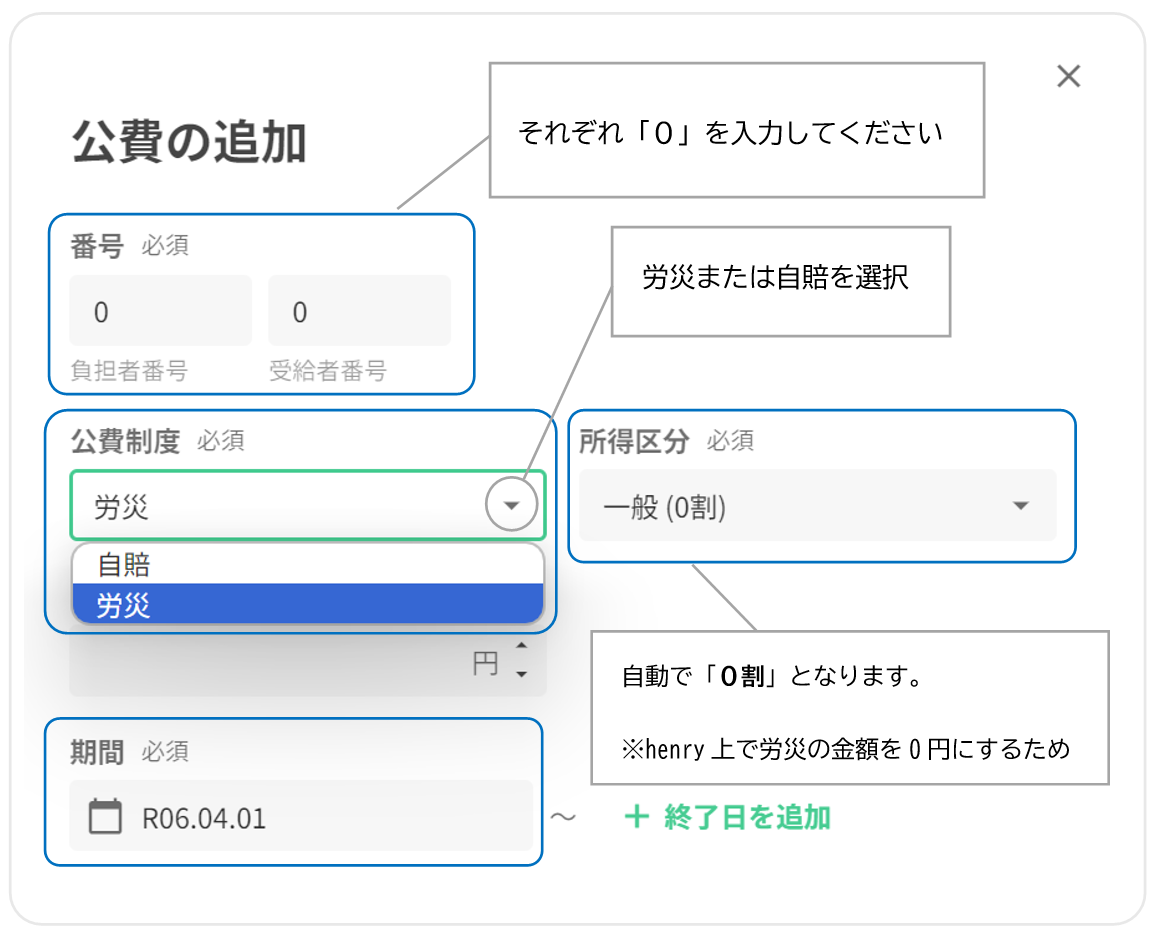 Henry上で「労災・自賠」(0割・ダミーの保険)を登録します。 ※公費登録画面にて「負担者番号・受給者番号」に「0・0」で数字を入力すると「労災or自賠」が選択できます。