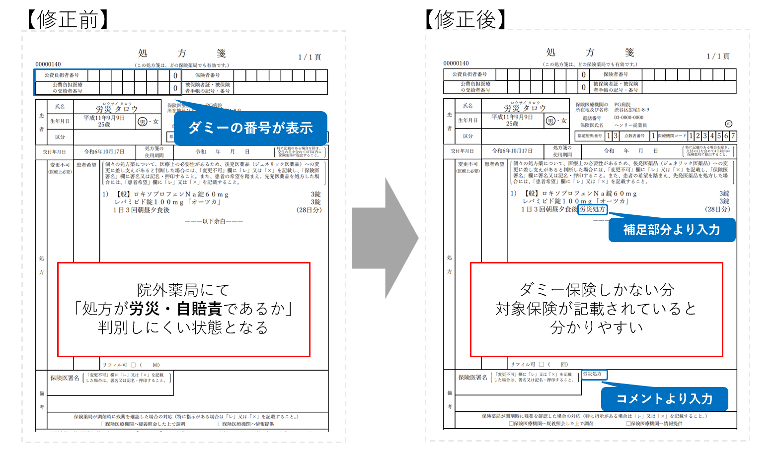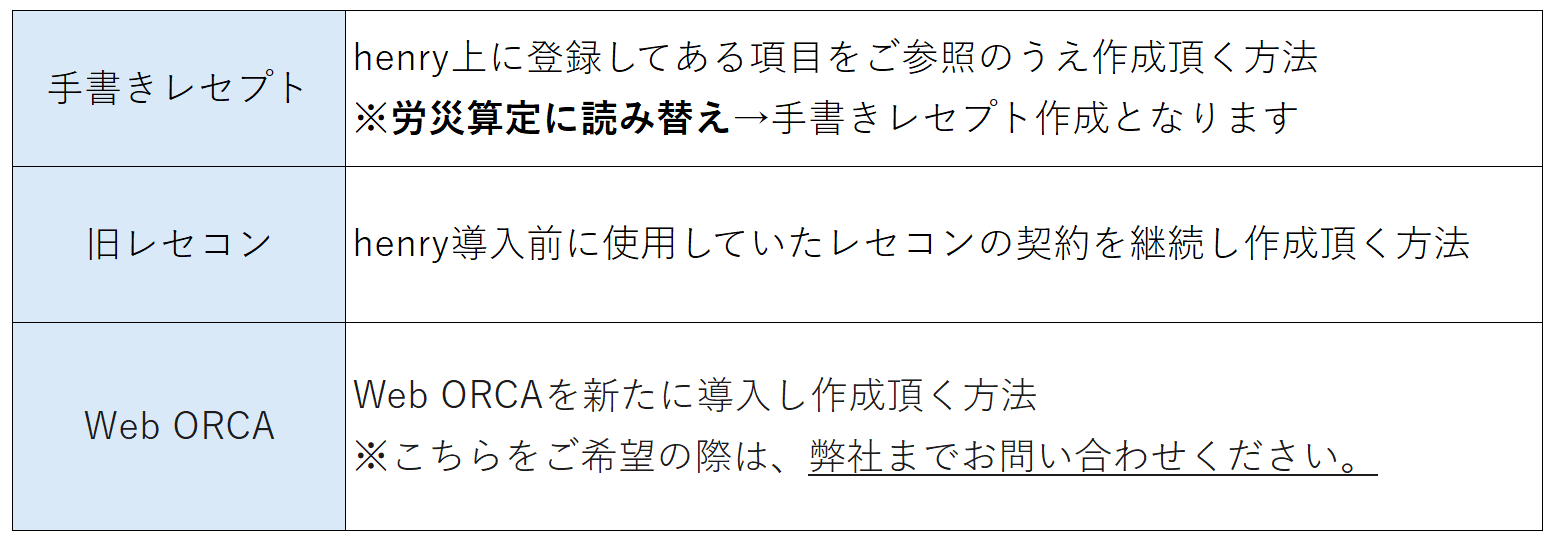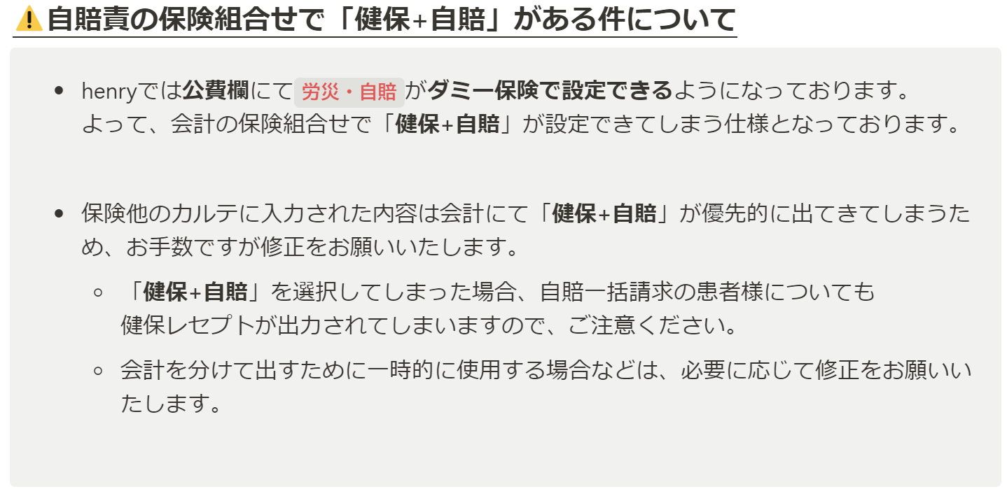 henry登録では労災・自賠保険をダミー登録しているため、処方箋に正しい保険が表示されない状態となっております。(詳細は画像にて)