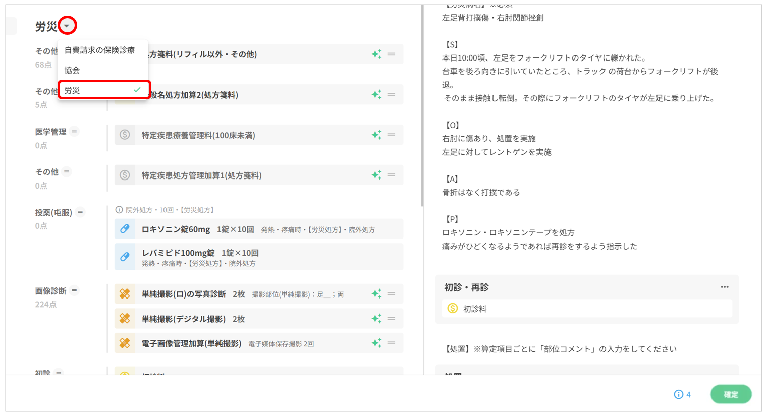 ①保険組み合わせを労災もしくは自賠に変更します。 (労災もしくは自賠が適用されたコストはどのようなものも0円になります)